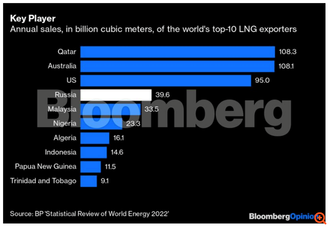 Αν αφήσουμε την Κίνα στην άκρη, η Ιαπωνία, η Γαλλία και η Ισπανία αντιπροσωπεύουν μεγάλο μέρος των αγορών αυτών. Στην τρέχουσα τροχιά τους, οι ρωσικές πωλήσεις LNG θα σημειώσουν ετήσιο υψηλό-ρεκόρ το 2022, σύμφωνα με εκτιμήσεις που βασίζονται σε δεδομένα παρακολούθησης δεξαμενόπλοιων που συγκεντρώθηκαν από το Bloomberg.