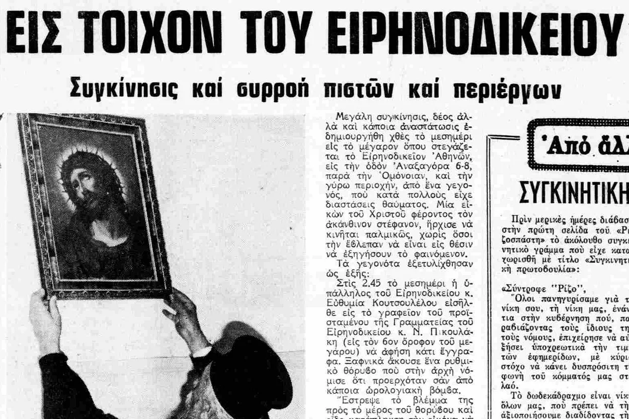 «Μεγάλη συγκίνησις, δέος αλλά και κάποια αναστάτωσις εδημιουργήθη χθες το μεσημέρι εις το μέγαρον όπου στεγάζεται το Ειρηνοδικείον Αθηνών, εις την οδόν Αναξαγόρα 6-8, παρά την Ομόνοιαν και την γύρω περιοχήν, από ένα γεγονός, που κατά πολλούς είχε διαστάσεις θαύματος.