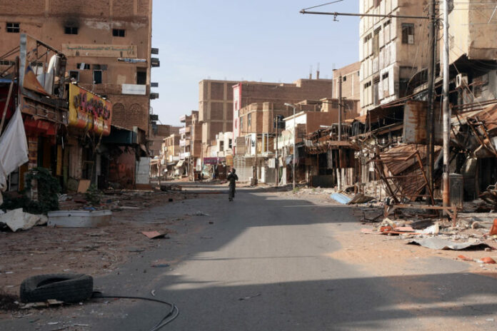 Ένας δρόμος στην πόλη Omdurman καταστράφηκε στον εμφύλιο πόλεμο που διήρκεσε ένα χρόνο. Οι κάτοικοι της πόλης έχουν βρεθεί πολιορκημένοι στα σπίτια τους, παγιδευμένοι μεταξύ των RSF και του στρατού. REUTERS/El Tayeb Siddig