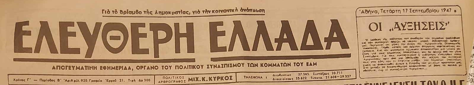 Στην εφημερίδα «Ελεύθερη Ελλάδα» και, ειδικότερα, στο εξώφυλλο της 17ης Σεπτεμβρίου 1947 είναι δημοσιευμένο μέσα σε πλαίσιο δεξιά του τίτλου της εφημερίδας το ακόλουθο κείμενο:
