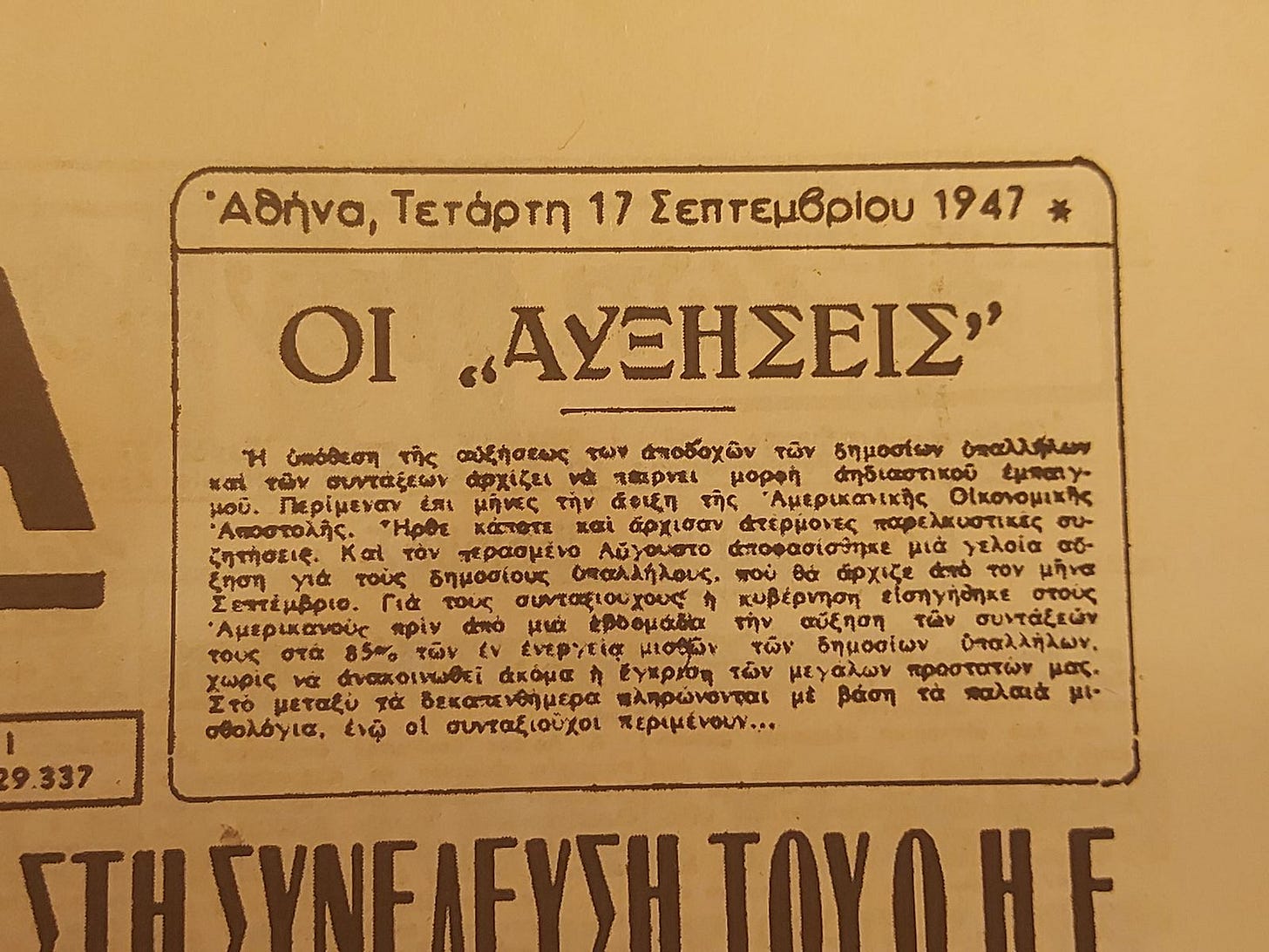Για «γελοία αύξηση» μιλούσε το δημοσίευμα του 1947, σταθερά γελοίες είναι και οι σημερινές αυξήσεις που προαναγγέλλουν και υλοποιούν οι κυβερνήσεις του 21ου (απατ)αιώνα.