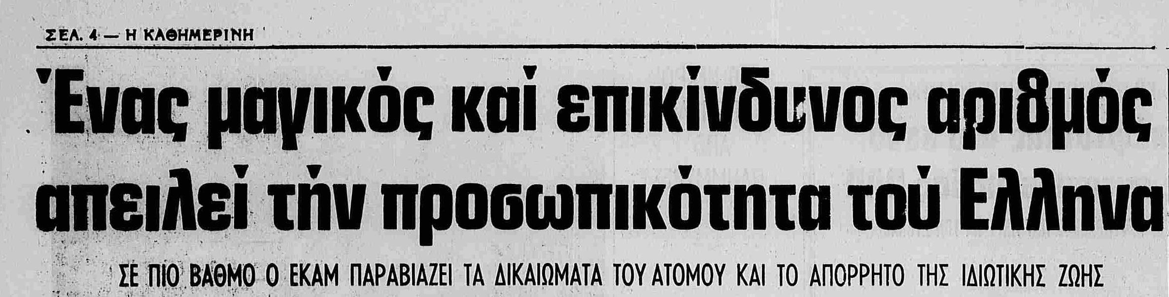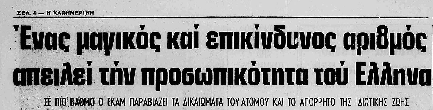 Στην εισαγωγή ενός αφιερώματος των δημοσιογράφων Φ. Καλλιαγκόπουλου και Γ. Ταμπακόπουλου της εφημερίδας «Η Καθημερινή» με τίτλο: «Ένας μαγικός και επικίνδυνος αριθμός απειλεί την προσωπικότητα του Έλληνα»1 και υπότιτλο «Σε ποιο βαθμό ο ΕΚΑΜ παραβιάζει τα δικαιώματα του ατόμου και το απόρρητο της ιδιωτικής ζωής;» διαβάζουμε τα ακόλουθα:2