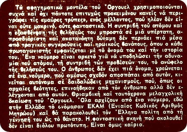 Όλα αρχίζουν από ένα νούμερο εδώ στην Ελλάδα το ονόμασαν ΕΚΑΜ (Ενιαίος Κωδικός Αριθμός Μητρώου) και θα παρακολουθεί τον Έλληνα πολίτη από τη γέννησή του ώς το θάνατο».