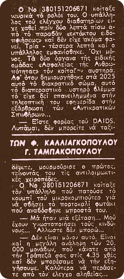 Δυστυχώς, ζούμε πλέον στο δυστοπικό έτος 2025 και όσοι έχουν μελετήσει τα ζητήματα που αφορούν τον Προσωπικό Αριθμό, δηλ. τον διάδοχο του ΕΚΑΜ, και τις νέες ηλεκτρονικές (ψευτο)ταυτότητες γνωρίζουν ότι η παραπάνω φανταστική σκηνή με τον αριθμοποιημένο ταξιδιώτη και τον κρατικό υπάλληλο από την «ΚΑΘΗΜΕΡΙΝΗ» του 1987 κάθε άλλο παρά φανταστική είναι.