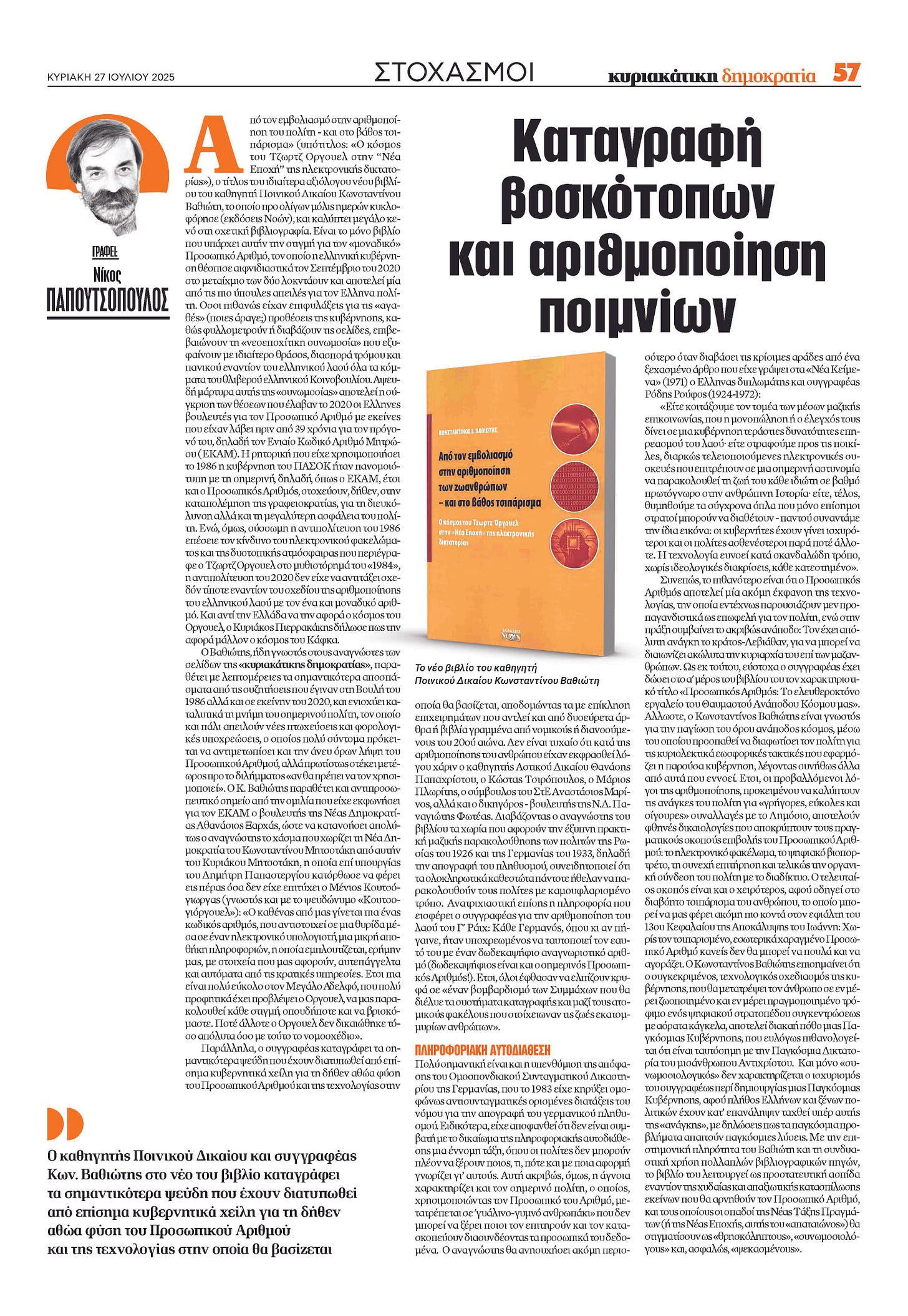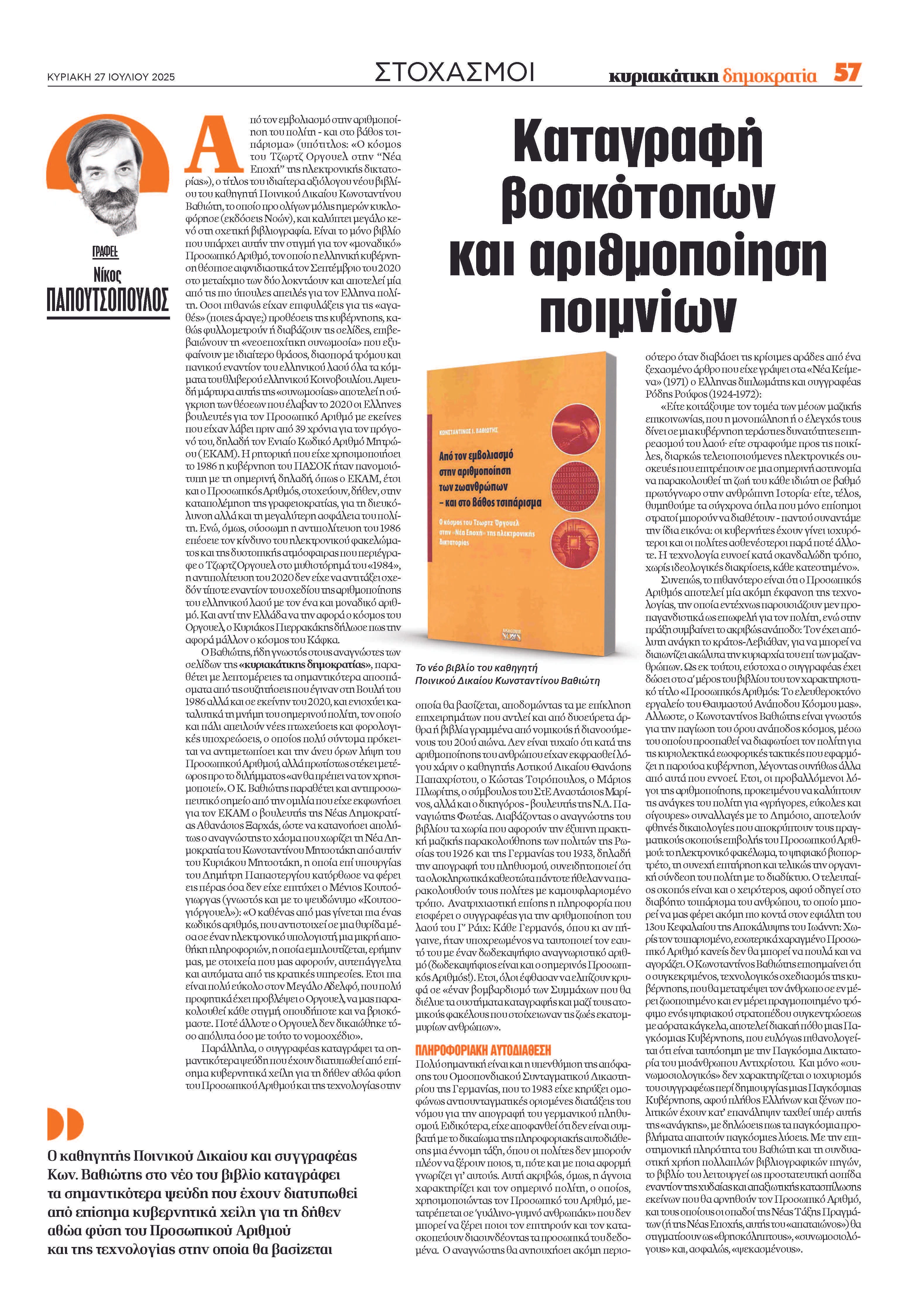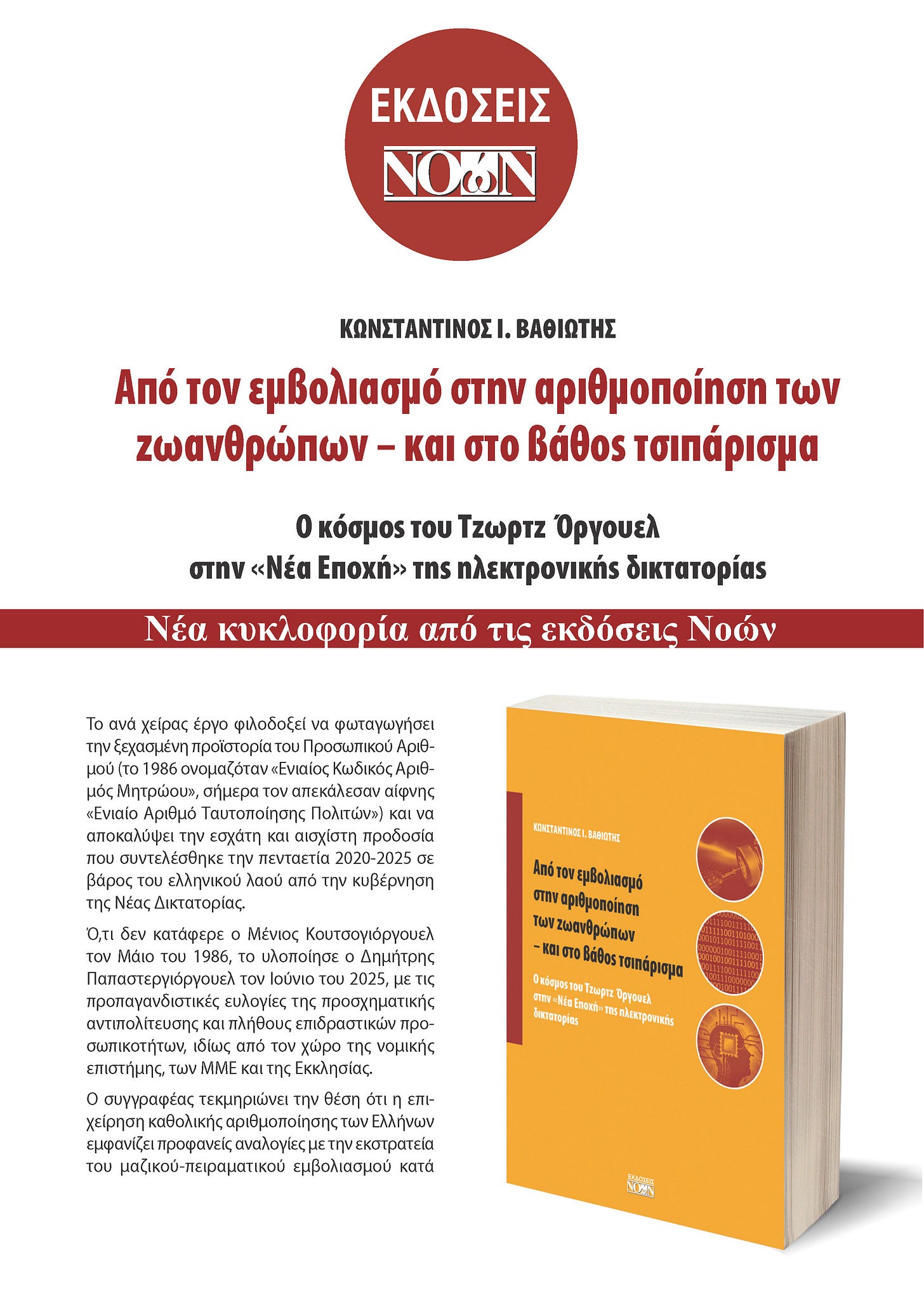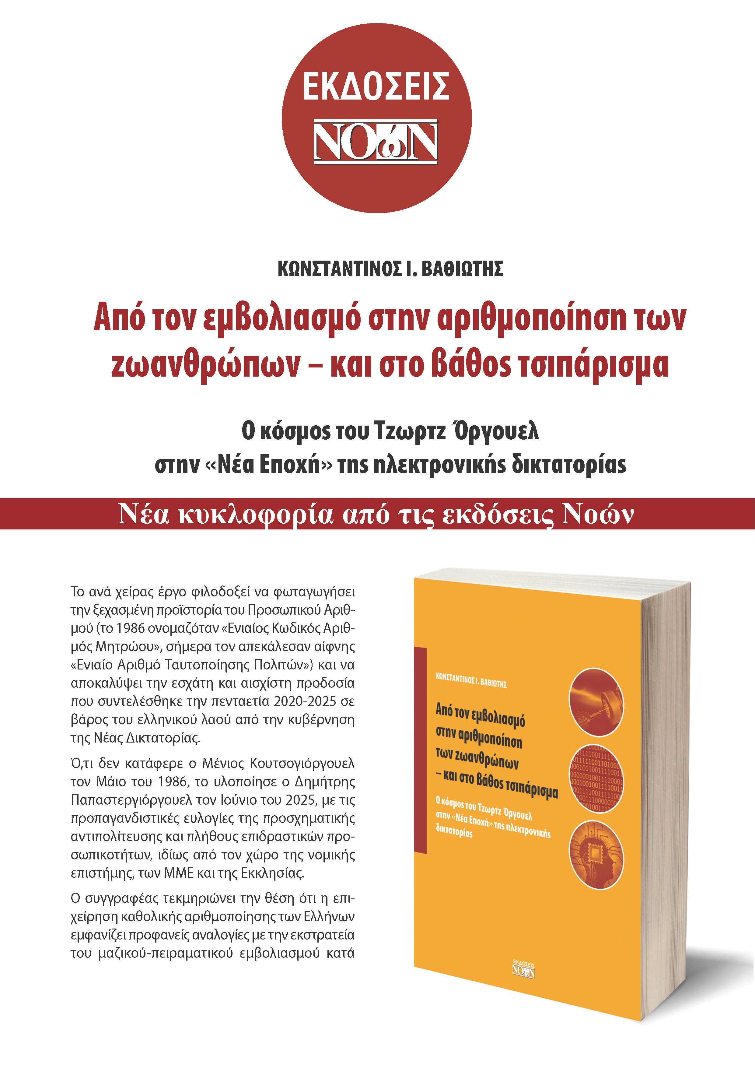 «Από τον εμβολιασμό στην αριθμοποίηση του πολίτη – και στο βάθος τσιπάρισμα» (υπότιτλος: «Ο κόσμος του Τζωρτζ Όργουελ στην Νέα Εποχή της ηλεκτρονικής δικτατορίας»), ο τίτλος του ιδιαίτερα αξιόλογου, νέου βιβλίου του καθηγητή Ποινικού Δικαίου Κωνσταντίνου Βαθιώτη, το οποίο προ ολίγων μόλις ημερών κυκλοφόρησε (εκδόσεις Νοών), και καλύπτει μεγάλο κενό στην σχετική βιβλιογραφία.