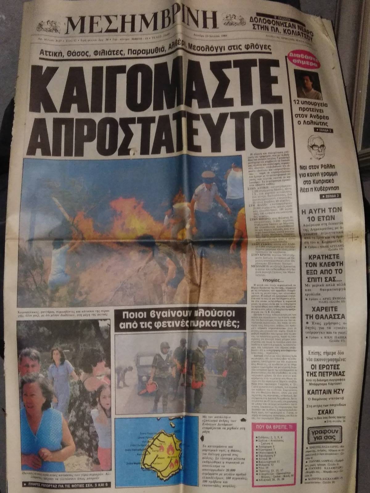 Την δεκαετία του 1980, όταν προσχηματικά-λαϊκιστικά επικηρύσσονταν οι «οικοπεδοφάγοι», οι Τούρκοι πράκτορες ή άλλης κατηγορίας εμπρηστές, στην κατάσβεση των πυρκαϊών βοηθούσαν άπαντες, από τον στρατό μέχρι τον απλό πολίτη, ο οποίος τότε δεν είχε ακόμη καταντήσει ένα φοβισμένο ανθρωπάκι που τρέμει τον ίσκιο του και τις φλόγες (παρατίθενται δύο χαρακτηριστικά εξώφυλλα εφημερίδων της δεκαετίας του 1980: σαν να μην πέρασε μια μέρα).