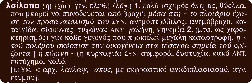 Λόγω του εκφραστικού αναδιπλασιασμού (λαι-λα), η λέξη προσφέρεται για την κατατρομοκράτηση του πολίτη, ο οποίος θα κάνει το λάθος να στηθεί μπροστά στην οθόνη της τηλεόρασής του, προκειμένου να πληροφορηθεί ποιο δάσος έχει πάρει σειρά για την καθιερωμένη «κακοκαιρινή» θυσία του στο βωμό του μεγαλεπήβολου μητσοτακικού σχεδίου για την μετατροπή της Ελλάδας σε «μπαταρία της Ευρώπης», διά της αντικαταστάσεως των πράσινων δέντρων με λευκές ανεμογεννήτριες, το γνωστό προϊόν που λανσάρει η μισάνθρωπη και αντίχριστη Νέα Τάξη Πραγμάτων.