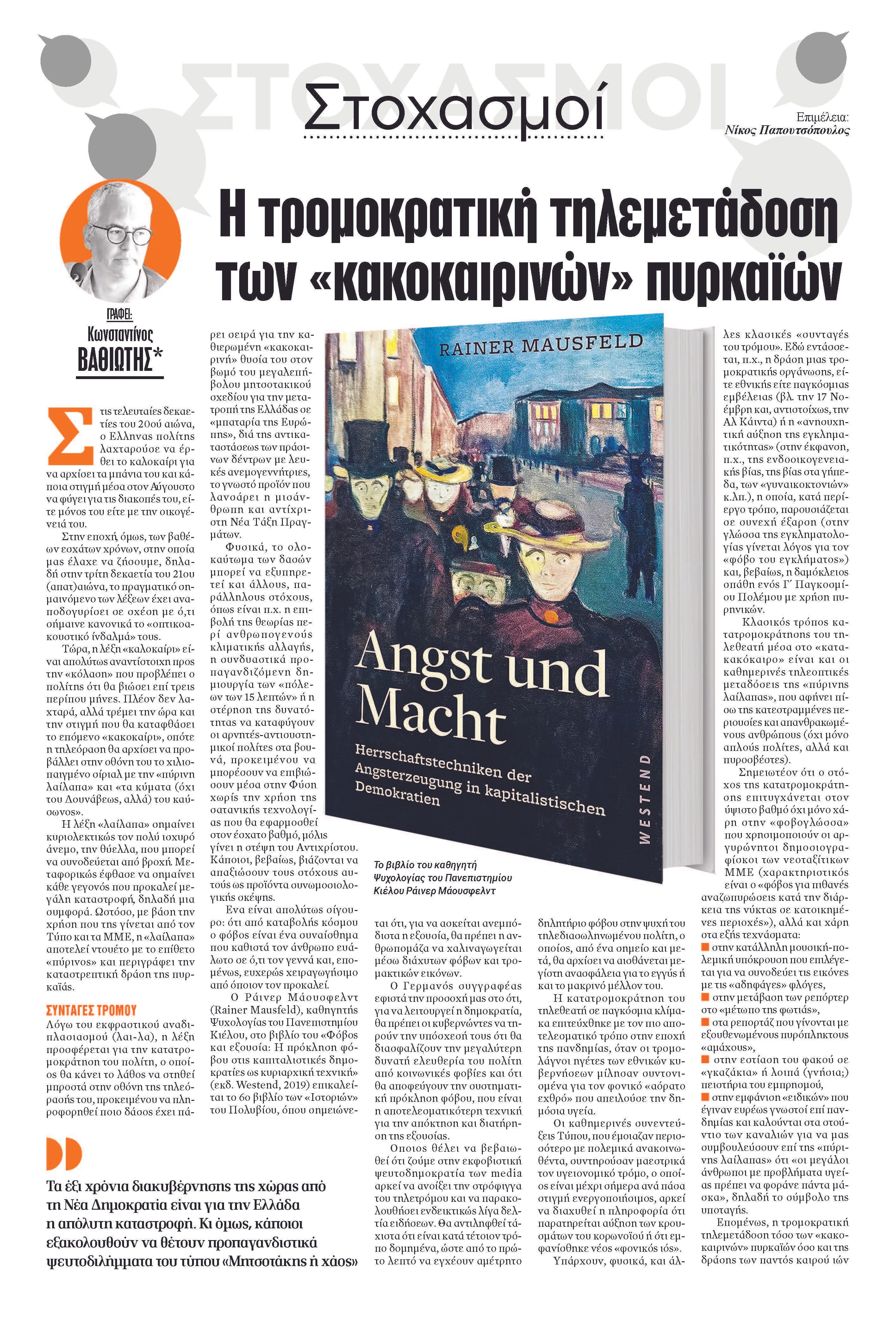 Ο Ράινερ Μάουσφελντ (Rainer Mausfeld), καθηγητής ψυχολογίας Πανεπιστημίου Κιέλου, στο βιβλίο του «Φόβος και εξουσία: Η πρόκληση φόβου στις καπιταλιστικές δημοκρατίες ως κυριαρχική τεχνική» (εκδ. Westend, 2019) επικαλείται το 6ο βιβλίο των Ιστοριών του Πολυβίου, επισημαίνοντας ότι, για να ασκείται ανεμπόδιστα η εξουσία, θα πρέπει η ανθρωπομάζα να χαλιναγωγείται μέσω διάχυτων φόβων και τρομακτικών εικόνων.