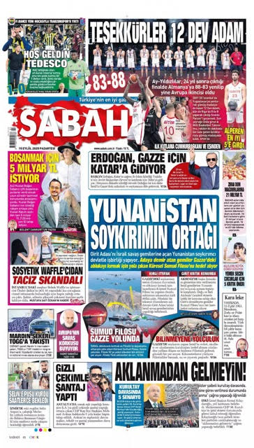 Παράλληλα, η Sabah προχωρά ακόμα πιο μακριά, με τον πρωτοσέλιδο τίτλο «Η Ελλάδα, συνένοχη στη γενοκτονία». Η εφημερίδα περιγράφει ως «βρώμικη συμμαχία» την απόφαση της ελληνικής κυβέρνησης να επιτρέψει τον ελλιμενισμό ισραηλινών πολεμικών πλοίων στην Κρήτη.