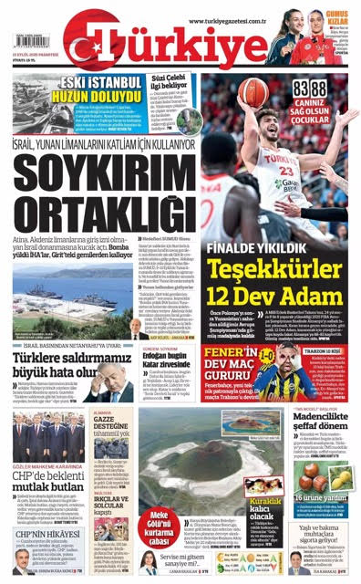 Η εφημερίδα Türkiye κυκλοφόρησε με τον εξαιρετικά φορτισμένο τίτλο: «Ισραήλ – Ελλάδα: Συνεργασία Γενοκτονίας». Στο σχετικό ρεπορτάζ αναφέρεται ότι η Ελλάδα άνοιξε «διάπλατα τα λιμάνια της» στον ισραηλινό στόλο, που, όπως ισχυρίζεται, στερείται πρόσβασης σε άλλα μεσογειακά λιμάνια.