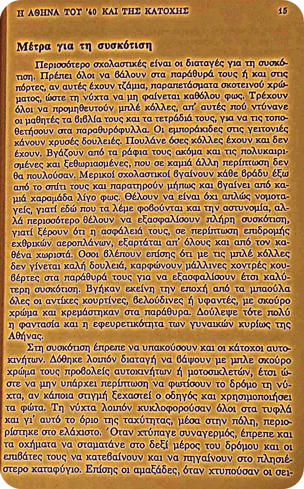 Όσοι βλέπουν επίσης ότι με τις μπλε κόλλες δεν γίνεται καλή δουλειά, καρφώνουν μάλλινες χοντρές κουβέρτες στα παράθυρά τους για να εξασφαλίσουν έτσι καλύτερη συσκότιση. Βγήκαν εκείνη την εποχή από τα μπαούλα όλες οι αντίκες κουρτίνες, βελούδινες ή υφαντές, με σκούρο χρώμα και κρεμάστηκαν στα παράθυρα. Δούλεψε τότε πολύ η φαντασία και η εφευρετικότητα των γυναικών κυρίως της Αθήνας.