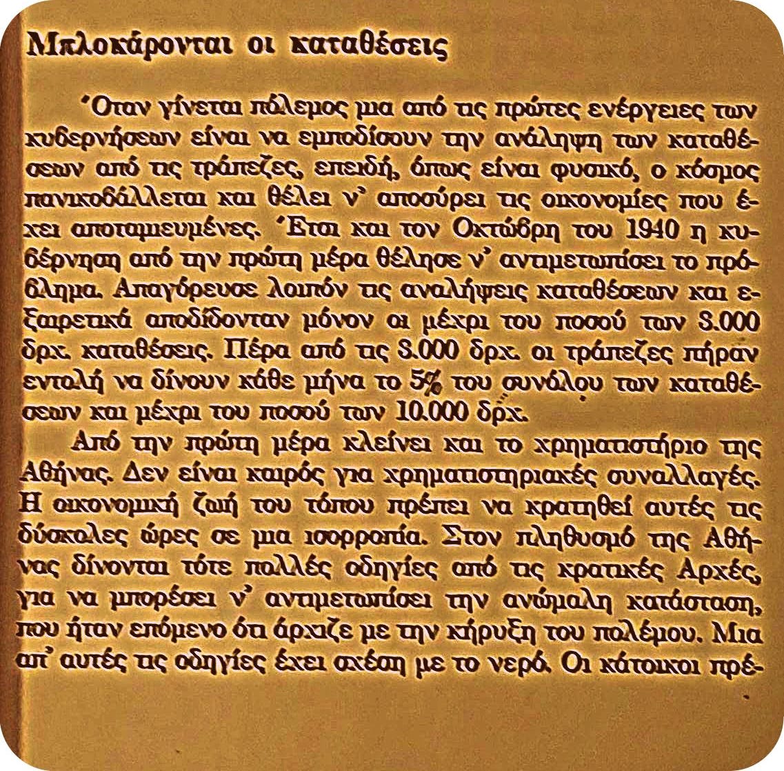 Έτσι και τον Οκτώβρη του 1940 η κυβέρνηση από την πρώτη μέρα θέλησε ν’ αντιμετωπίσει το πρόβλημα. Απαγόρευσε λοιπόν τις αναλήψεις καταθέσεων και εξαιρετικά αποδίδονταν μόνον οι μέχρι του ποσού των 3.000 δρχ. καταθέσεις. Πέρα από τις 3.000 δρχ., οι τράπεζες πήραν εντολή να δίνουν κάθε μήνα το 5% του συνόλου των καταθέσεων και μέχρι του ποσού των 10.000 δρχ.