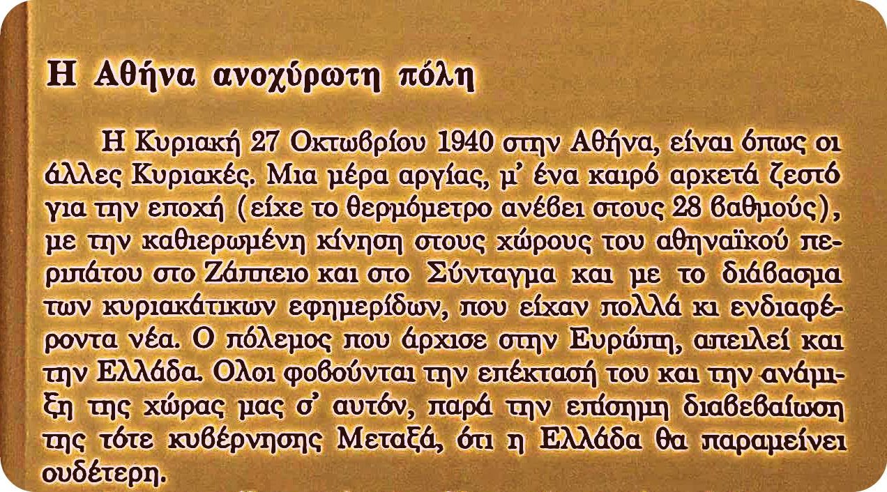 Η Κυριακή, 27 Οκτωβρίου 1940 στην Αθήνα είναι όπως οι άλλες Κυριακές. Μια μέρα αργίας, μ’ ένα καιρό αρκατά ζεστό για την εποχή (είχε το θερμόμετρο ανεβεί στους 28 βαθμούς), με την καθιερωμένη κίνηση στους χώρους του αθηναϊκού περιπάτου στο Ζάππειο και στο Σύνταγμα και με το διάβασμα των κυριακάτικων εφημερίδων, που είχαν πολλά και ενδιαφέροντα νέα.