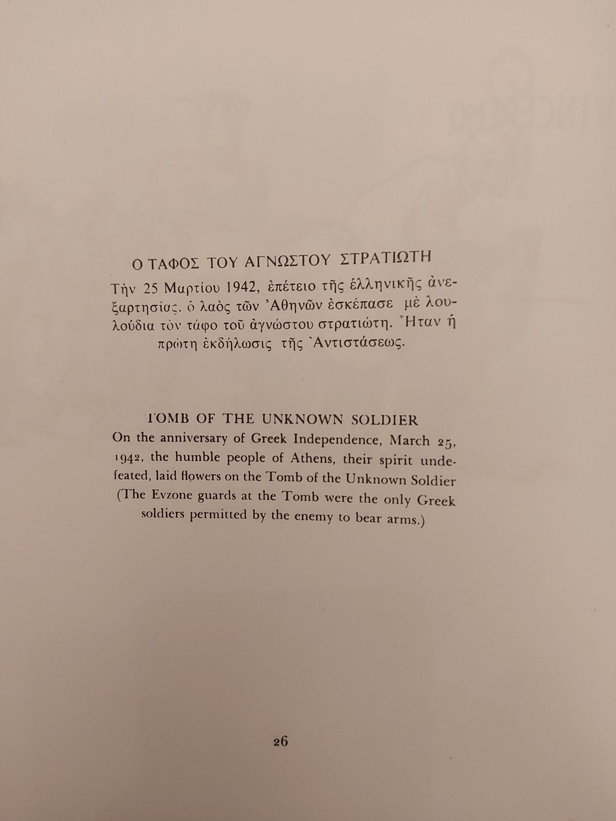 On the anniversary of Greek Independence, March 25, 1942, the humble people of Athens, their spirit undefeated, laid flowers on the Tomb of the Unknown Soldier (The Evzone guards at the Tomb were the only Greek soldiers permitted by the enemy to bear arms).