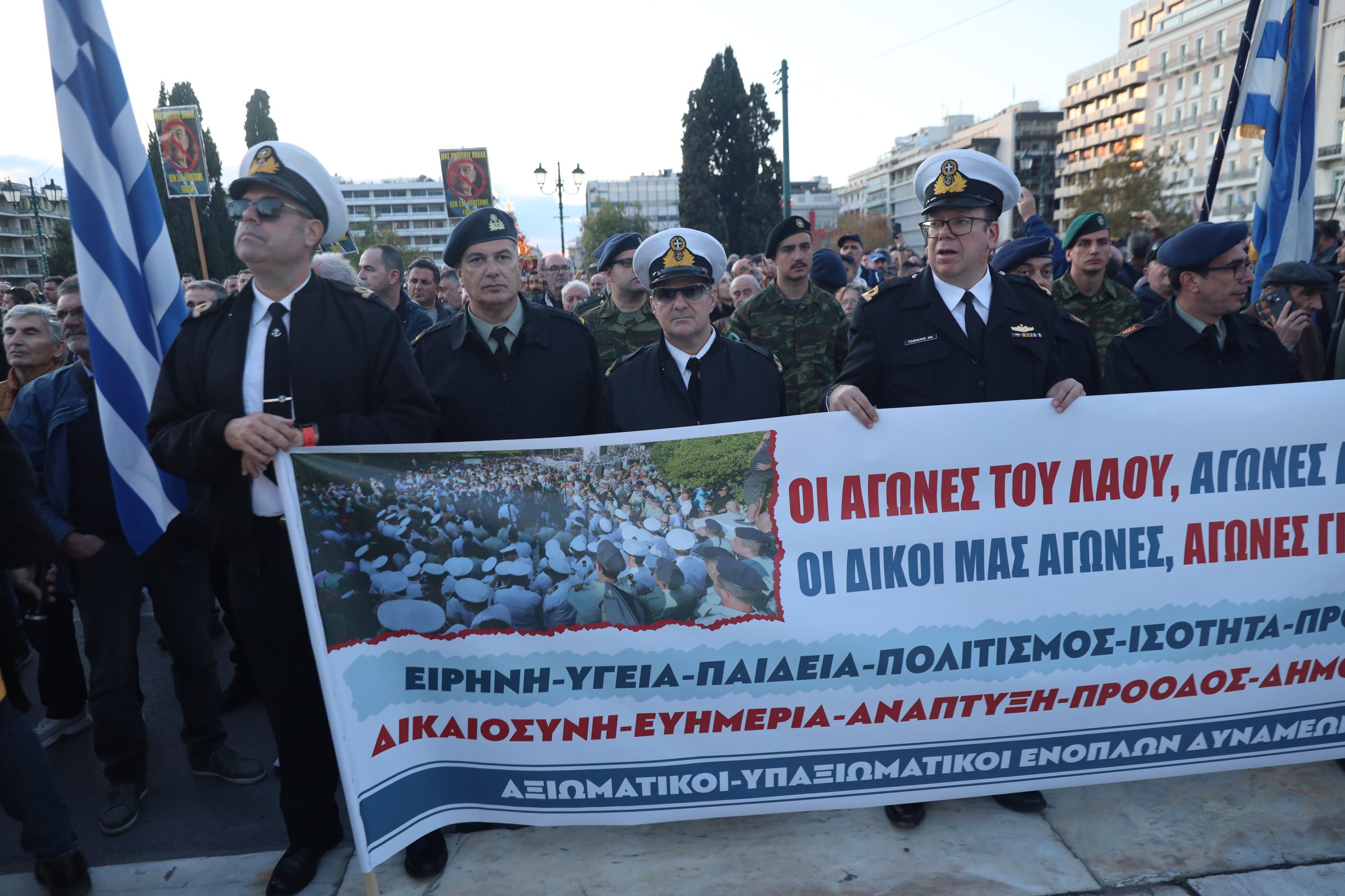 Συγκέντρωση απόστρατων και εν ενεργεία στρατιωτικών κατά του νομοσχεδίου του Υπουργείου Άμυνας στα Προπύλαια, και πορεία προς τη Βουλή. Σάββατο 29 Νοεμβρίου 2025