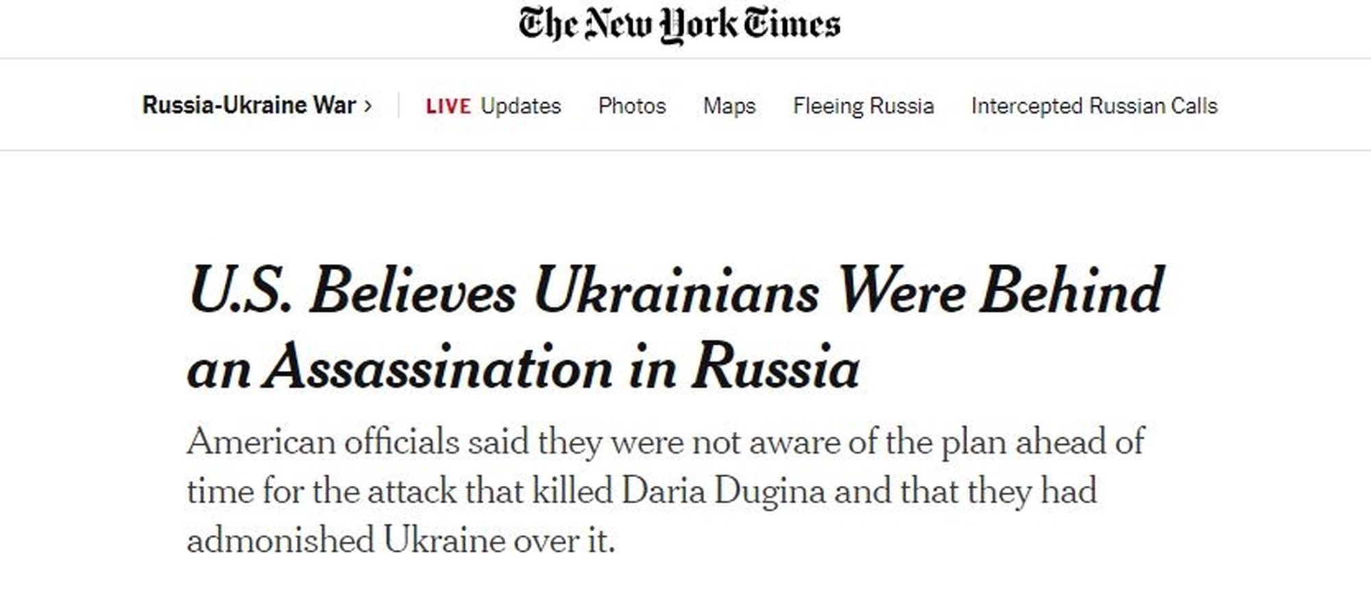 Οι μυστικές υπηρεσίες των Ηνωμένων Πολιτειών πιστεύουν ότι τμήματα της ουκρανικής κυβέρνησης ενέκριναν την επίθεση με παγιδευμένο αυτοκίνητο κοντά στη Μόσχα τον Αύγουστο, κατά την οποία σκοτώθηκε η Ντάρια Ντούγκινα, κόρη ενός εξέχοντος Ρώσου εθνικιστή, στοιχείο μιας μυστικής εκστρατείας που οι Αμερικανοί αξιωματούχοι φοβούνται ότι θα μπορούσε να διευρύνει τη σύγκρουση, όπως αποκαλύπτουν οι New York Times.