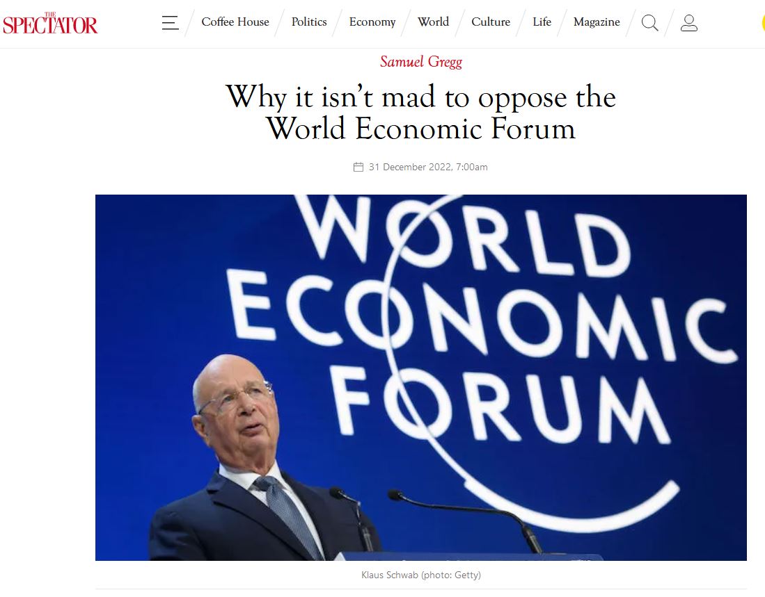 Ιδιαίτερο ενδιαφέρον παρουσιάζει το άρθρο σχετικά με το Οικονομικό Φόρουμ στο Νταβός (World Economic Forum), που δημοσιεύεται στο βρετανικό περιοδικό Spectator και φέρει την υπογραφή του καθηγητή και διακεκριμένου μέλος του American Institute for Economic Research, Σάμιουελ Γκρεγκ.
