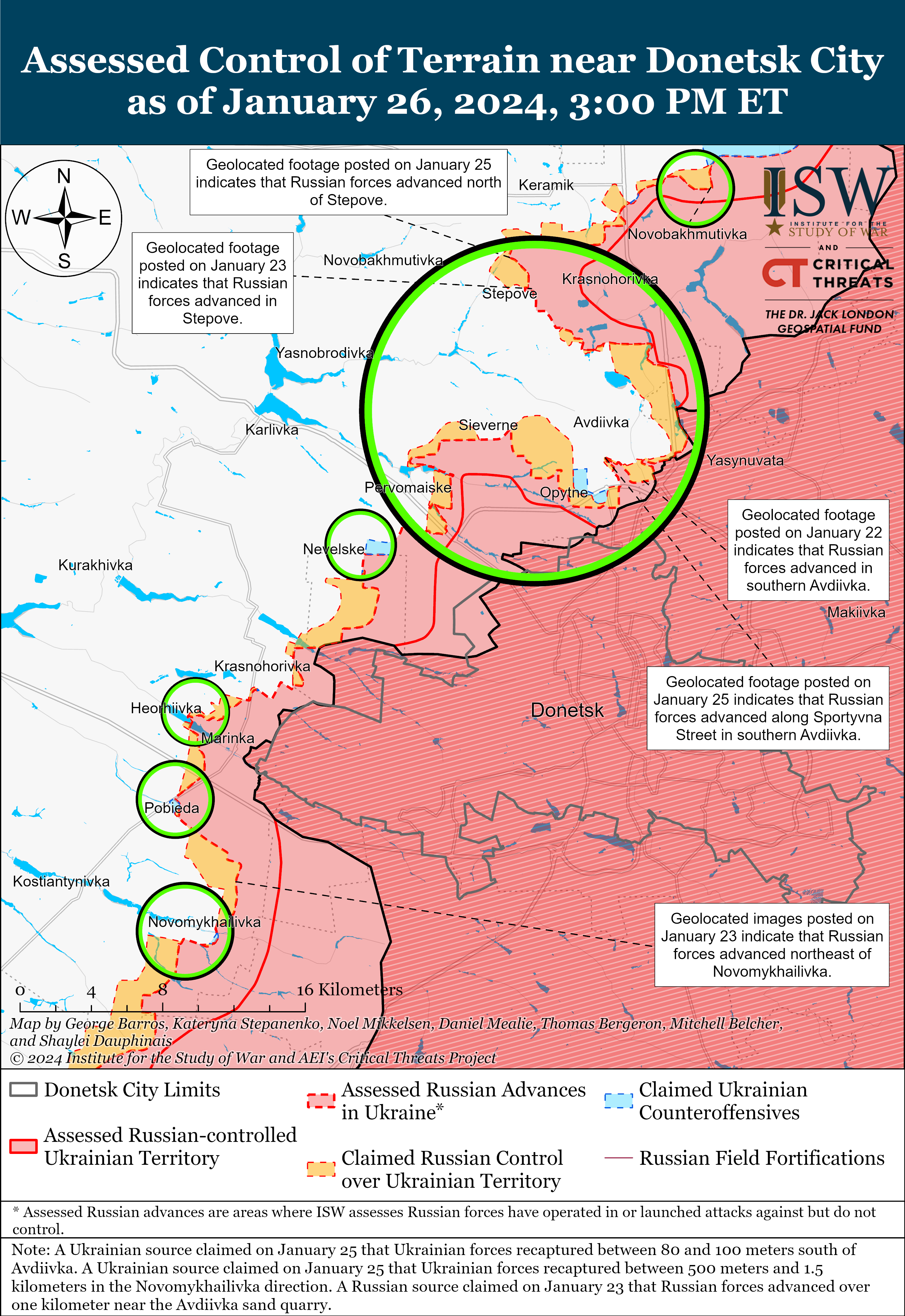 Οι ρωσικές δυνάμεις προχώρησαν πρόσφατα οριακά κοντά και στην Avdiivka εν μέσω συνεχιζόμενων θέσεων μάχης στην περιοχή στις 26 Ιανουαρίου.