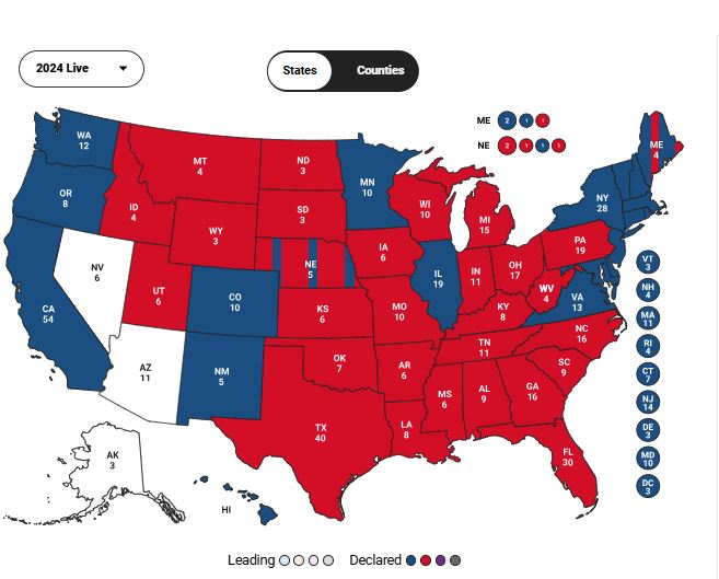 Τα αποτελέσματα, δίνουν στον Ντόναλντ Τραμπ μία ευρεία νίκη και με την επικράτηση του στις Πολιτείες της Βόρειας Καρολίνας, της Πενσυλβάνια και της Τζόρτζια, έγειρε οριστικά την πλάστιγγα υπέρ του.