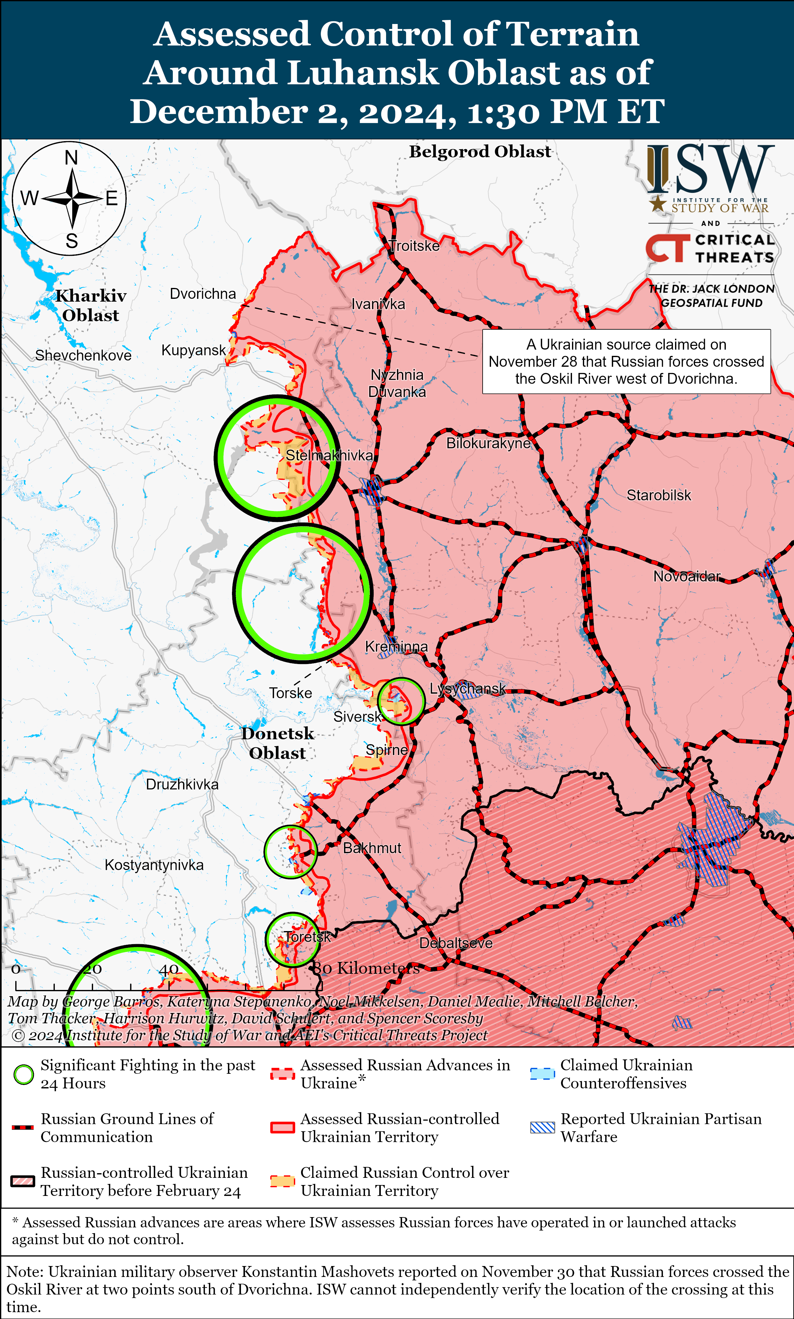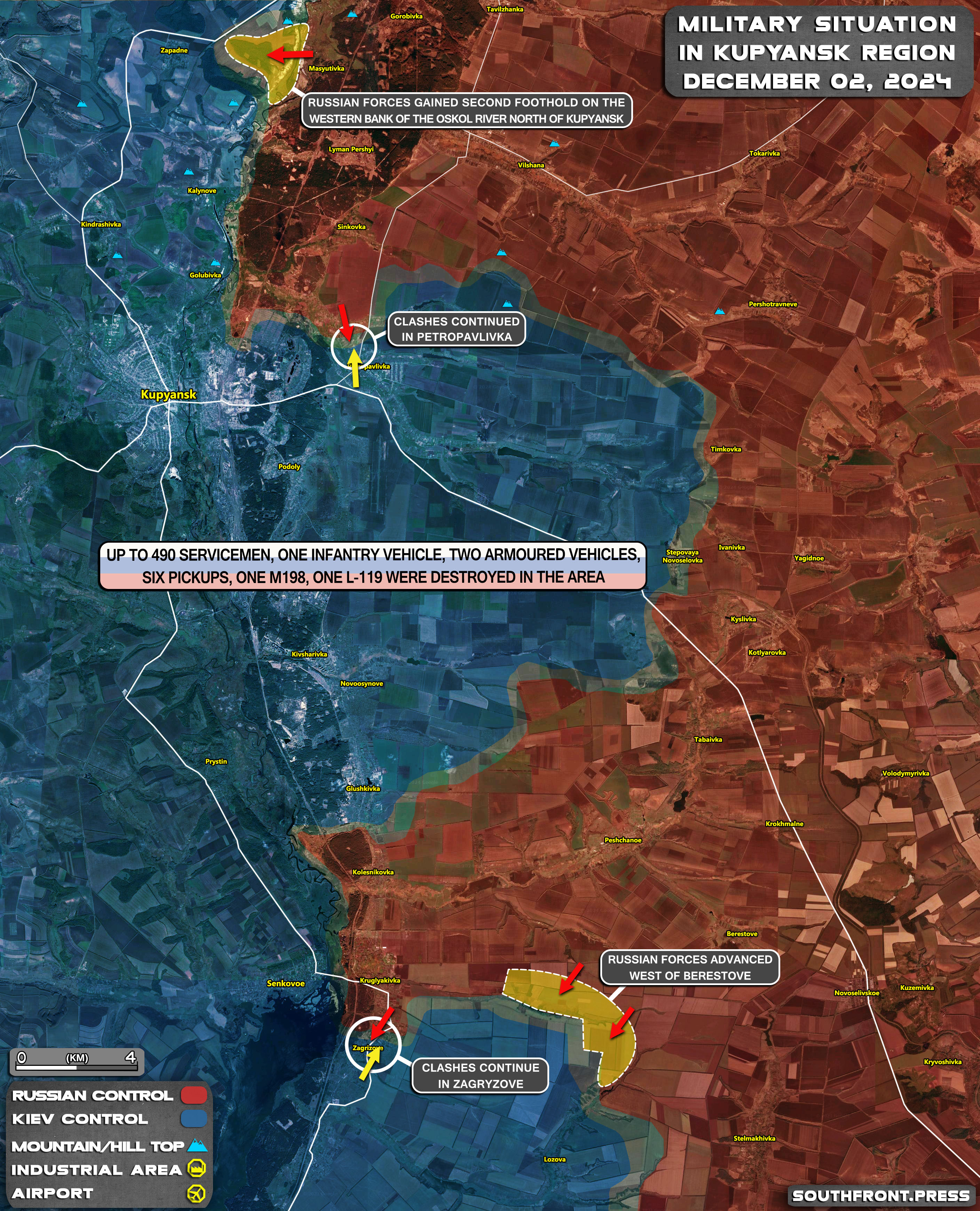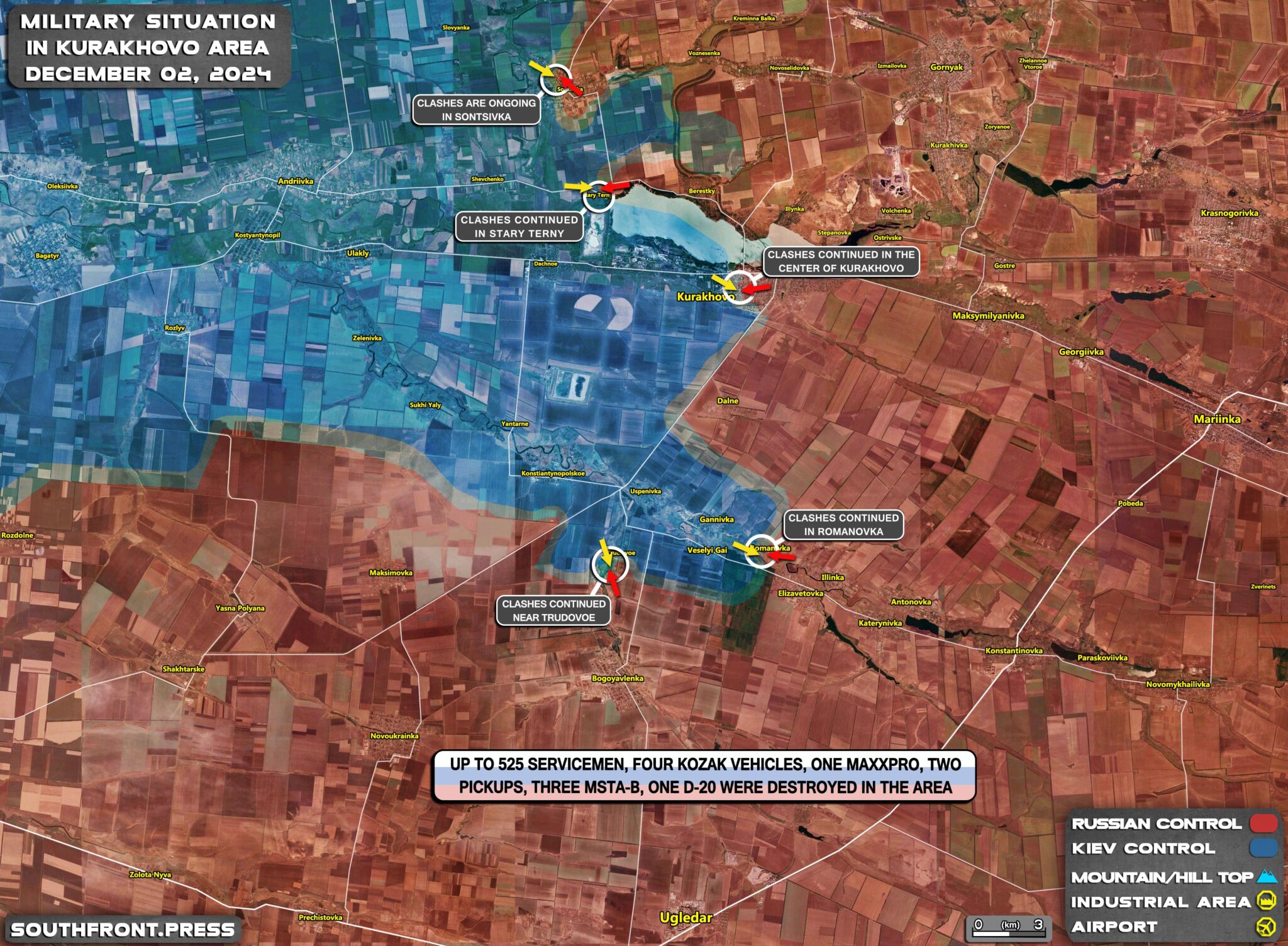 Γεωγραφικά πλάνα που δημοσιεύθηκαν την 1η Δεκεμβρίου δείχνουν ότι οι ρωσικές δυνάμεις προχώρησαν πρόσφατα οριακά βορειοδυτικά του Sontsivka (βορειοδυτικά του Kurakhove) και δυτικά του Berestky (βόρεια του Kurakhove και στη βόρεια ακτή της δεξαμενής Kurakhivske).