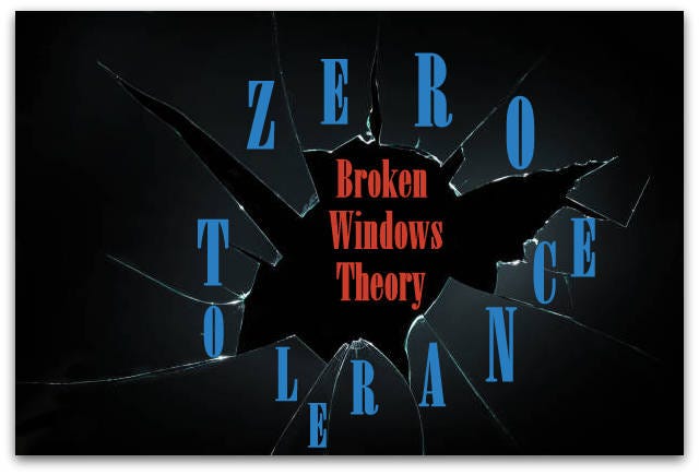 Σύμφωνα με τη συγκεκριμένη θεωρία, που διαμορφώθηκε το 1982 από τους κοινωνιολόγους James Q. Wilson και George L. Kelling, η αταξία και η έλλειψη φροντίδας στον αστικό χώρο (π.χ. σπασμένα παράθυρα, γκράφιτι, δημόσια μέθη, κ.ά.) δυνητικά οδηγούν σε αυξημένη εγκληματικότητα, καθώς δημιουργείται η εντύπωση ότι δεν υπάρχει έλεγχος και ότι η ανομία είναι ανεκτή.