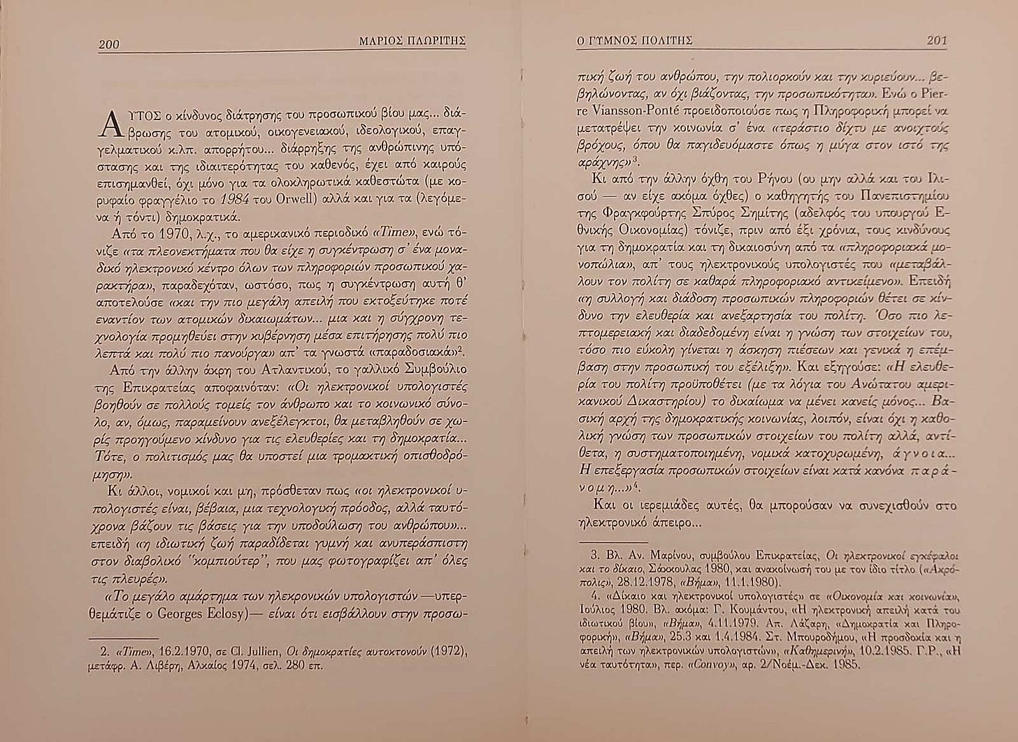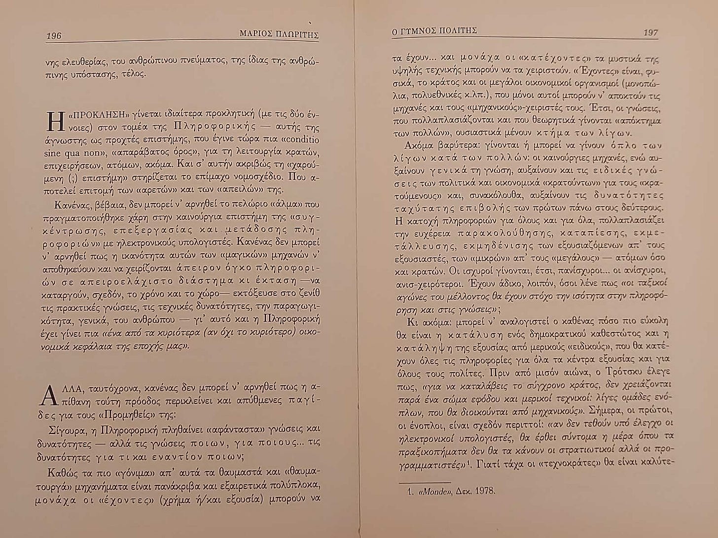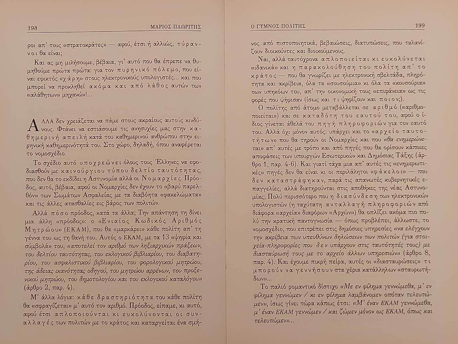 «Ο πολίτης», σημείωνε ο Πλωρίτης, «μεταβάλλεται σε αριθμό (“αριθμοποιείται”) και σε καταδότη του εαυτού του, αφού ο ίδιος γίνεται άθελά του πηγή πληροφοριών για τον εαυτό του».