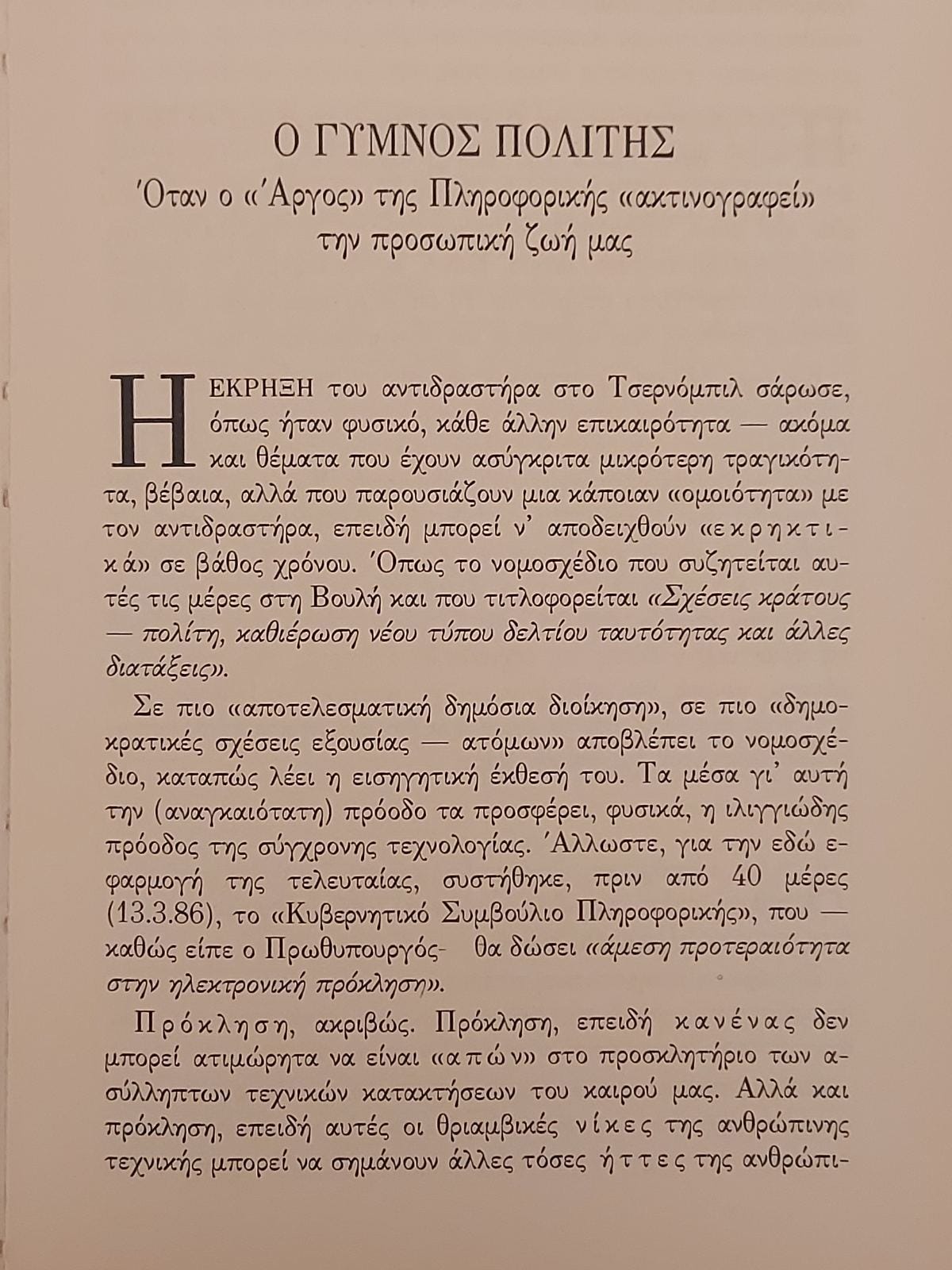 Ένα τέτοιο μυαλό τόλμησε το 1986 να γράψει, μεταξύ των άλλων, ότι ο Προσωπικός Αριθμός της εποχής Κουτσόγιωργα, δηλ. ο Ε.Κ.Α.Μ., «θα “μαρκάρει” κάθε πολίτη απ’ τη γέννα του ώς τη θανή του» κι έτσι «κάθε δραστηριότητα του κάθε πολίτη θα “σφραγίζεται” μ’ αυτό τον αριθμό».