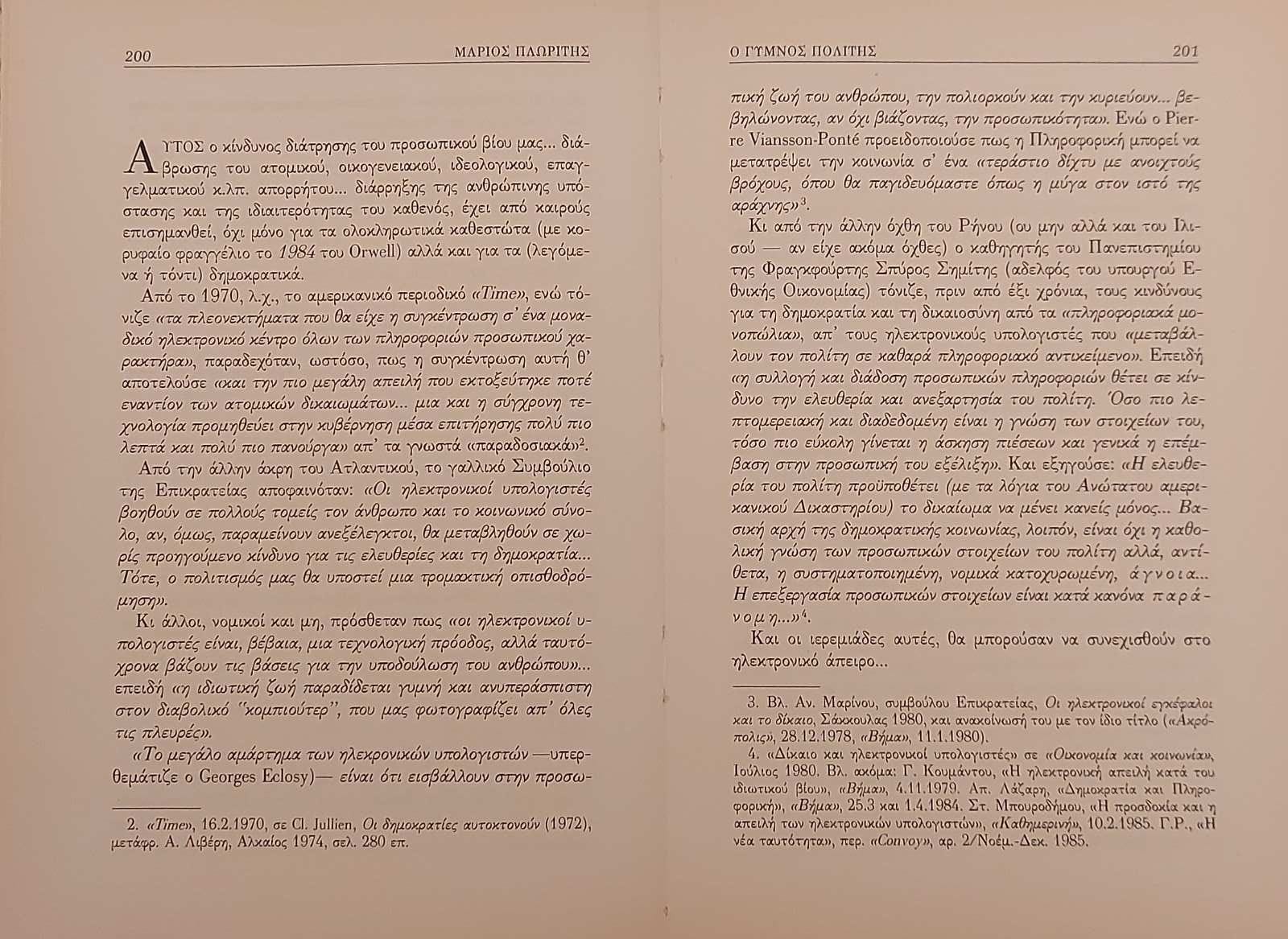 Ο Πλωρίτης εφιστούσε την προσοχή του αναγνώστη στο γεγονός ότι «η διασύνδεση των ηλεκτρονικών υπολογιστών (η ταχύτατη ανταλλαγή πληροφοριών από διάφορα “αρχεία” διαφόρων “Αρχών”) θα οπλίζει ακόμα πιο πολύ την κρατική παντογνωσία», συνέδεε δε τον κίνδυνο διάτρησης του προσωπικού βίου μας με την πρακτική που ακολουθούν τα ολοκληρωτικά καθεστώτα τύπου οργουελικής Ωκεανίας, της χώρας δηλαδή εκείνης, στην οποία ζούσε ο αντικαθεστωτικός-αρνητής Ουίνστον Σμίθ, ο ήρωας του δυστοπικού μυθιστορήματος «1984» του Τζωρτζ Όργουελ.