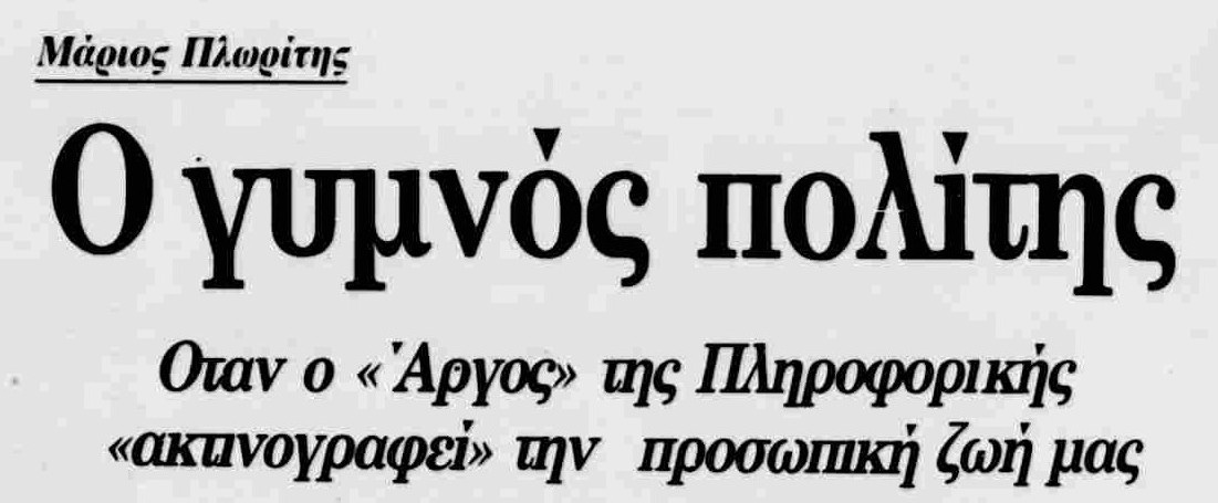 Με αφορμή την νομοθετική πρωτοβουλία του 1986 για την θέσπιση του Ενιαίου Κωδικού Αριθμού Μητρώου (Ε.Κ.Α.Μ.), δηλ. του προκατόχου του σημερινού Προσωπικού Αριθμού, ο Μάριος Πλωρίτης είχε γράψει στην εφημερίδα «Τo Βήμα» της 25ης Μαΐου 19861 ένα άρθρο με τίτλο «Ο γυμνός πολίτης» και υπότιτλο «Όταν ο “Άργος” της Πληροφορικής “ακτινογραφεί” την προσωπική ζωή μας» (στην ελληνική μυθολογία, ο Άργος ήταν ένας γίγαντας πανόπτης με εκατό μάτια).
