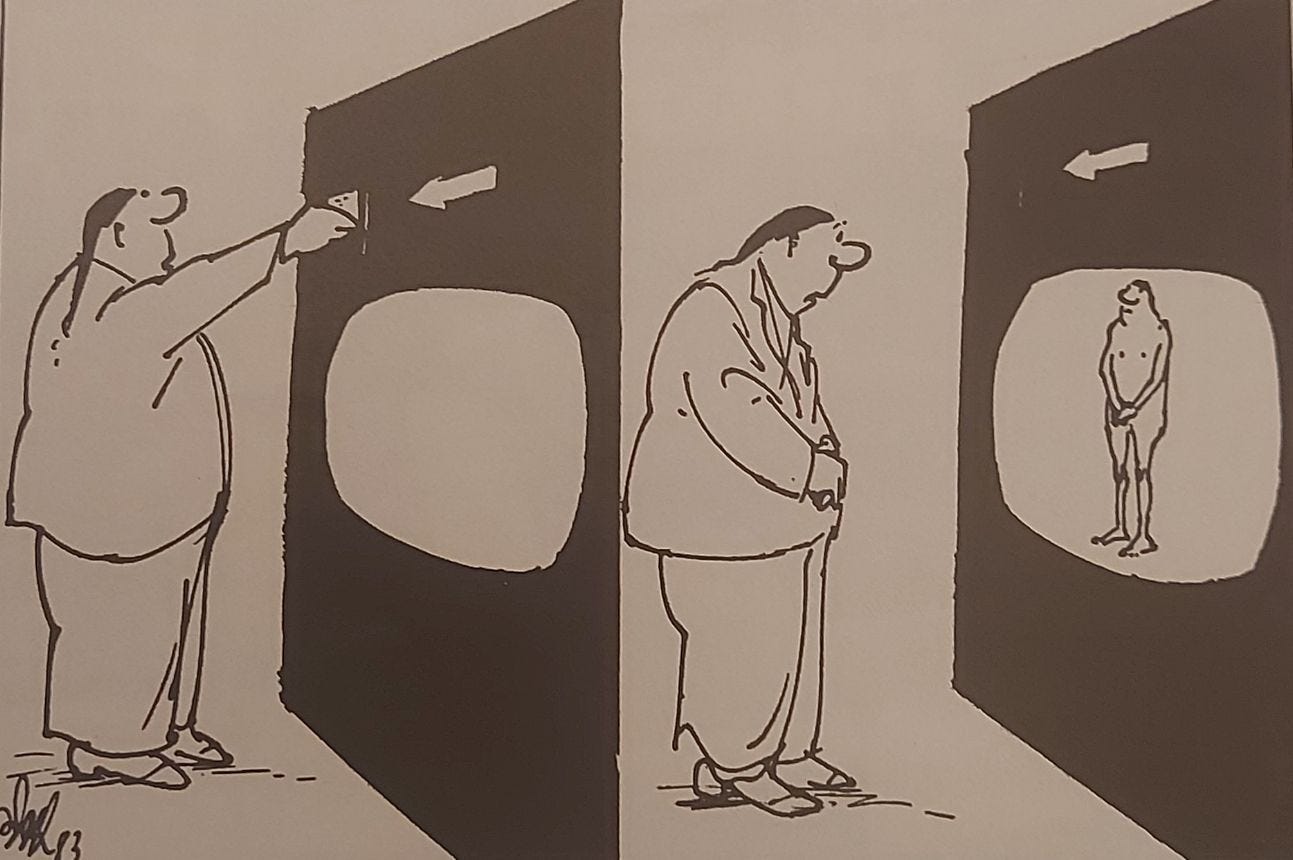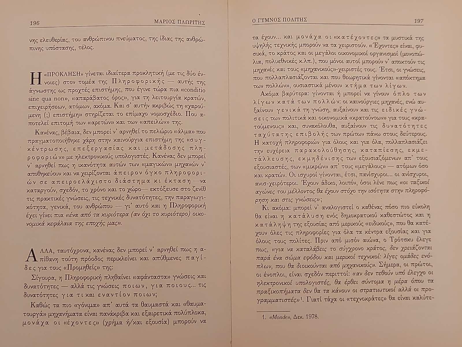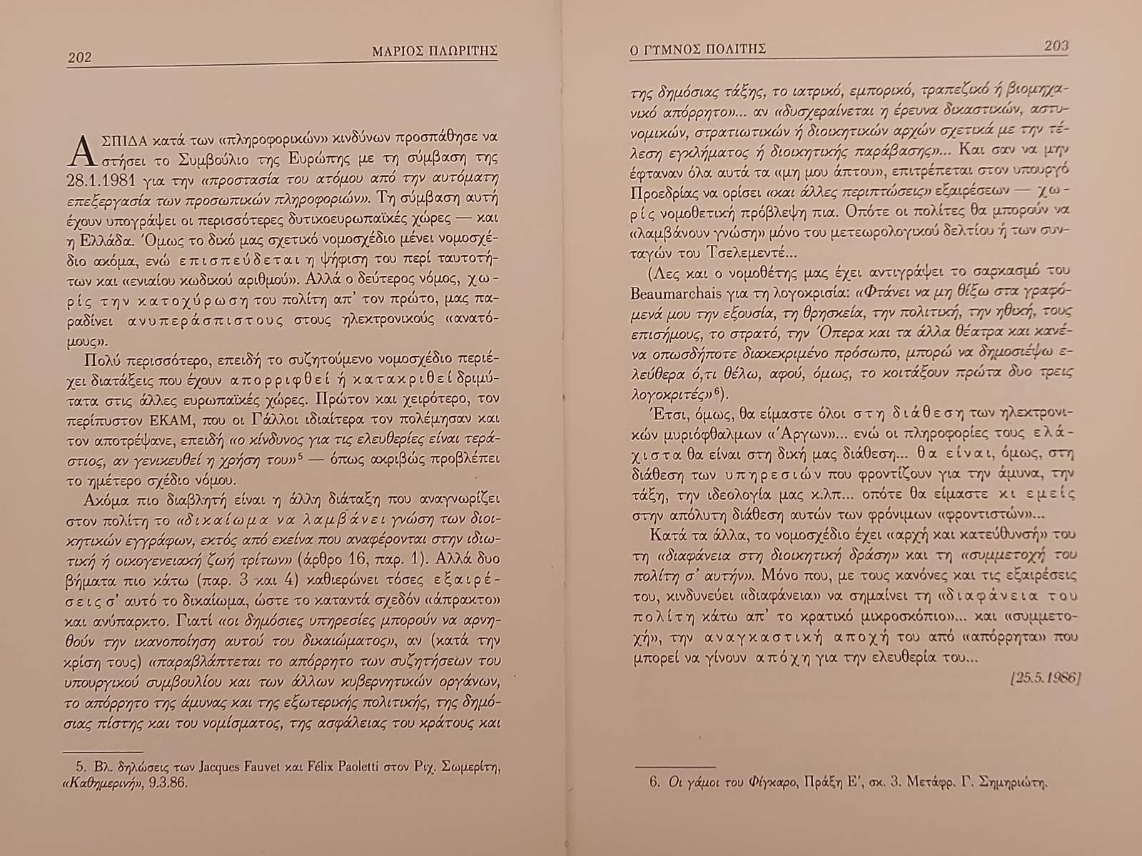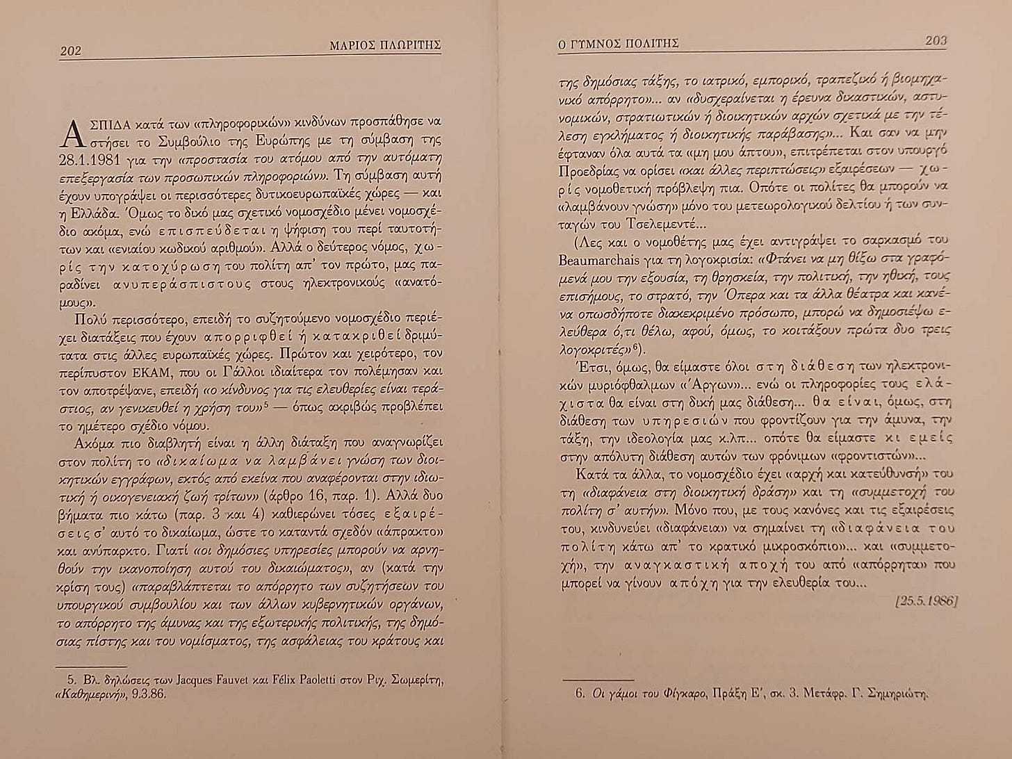 ΣΗΜΕΙΩΣΗ: Το σκίτσο με τον γυμνό πολίτη που έχει προταχθεί στην αρχή του παρόντος κειμένου είναι ειλημμένο από το γερμανικό περιοδικό Der Spiegel, το οποίο είχε κυκλοφορήσει στις 10 Φεβρουαρίου 19868. Το ίδιο σκίτσο είχε επιλέξει και ο Πλωρίτης για το εδώ παρουσιασθέν άρθρο του, που αξιοποιήθηκε για την τρίτη αναμνηστική δόση του αναγκαίου πνευματικού εμβολιασμού μας.