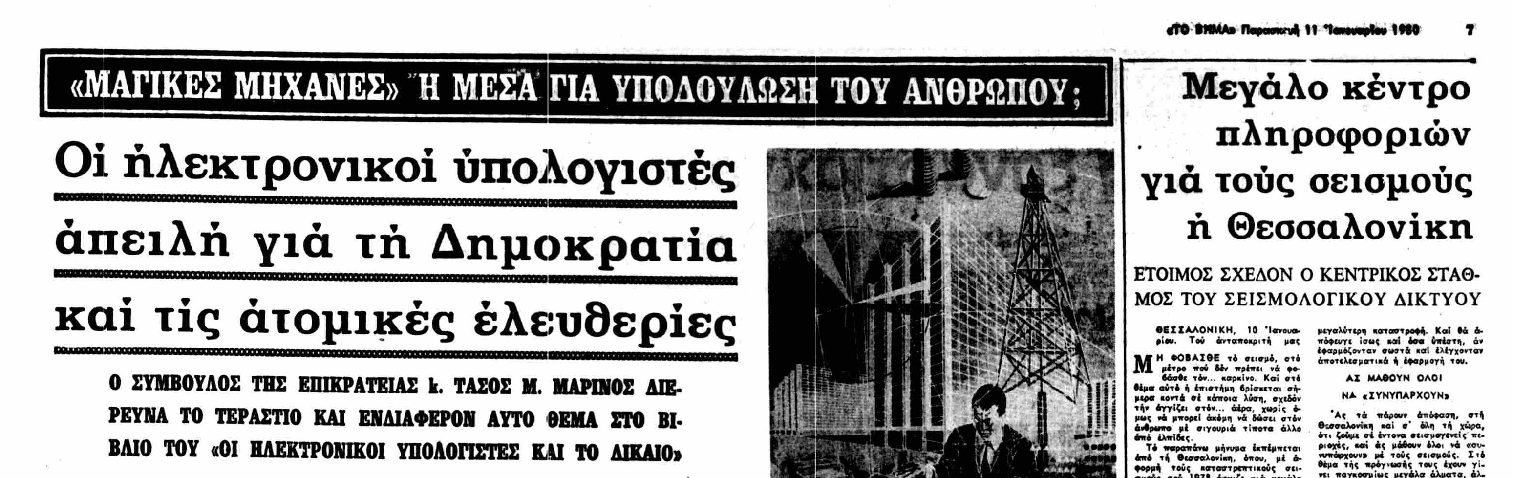Και αληθεύει μεν «ότι ο ηλεκτρονικός υπολογιστής είναι μέσο με την βοήθεια του οποίου απαλλάσσεται ο άνθρωπος από το ανιαρό και ενοχλητικό χαρτοβασίλειο, πλην όμως είναι δυνατό να μεταβληθεί σε όργανο καταπιέσεως, εάν περιέλθει στα χέρια ενός αδίστακτου ανθρώπου».