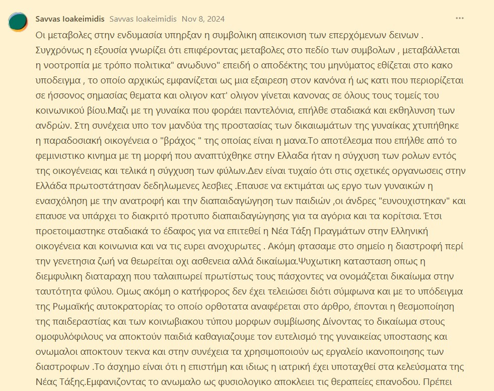 Στις 8 Νοεμβρίου 2024, ο μακαρίτης Σάββας Ιωακειμίδης, τακτικός σχολιογράφος και φανατικός αναγνώστης του παρόντος ιστολογίου, είχε γράψει, κάτω από το κείμενο που εδώ παραπέμπεται στην υποσημείωση 12, το εξής σχόλιο (ήταν ήδη κατάκοιτος και πληκτρολογούσε με το ένα δάχτυλο):«Οι μεταβολές στην ενδυμασία υπήρξαν η συμβολική απεικόνιση των επερχόμενων δεινών.