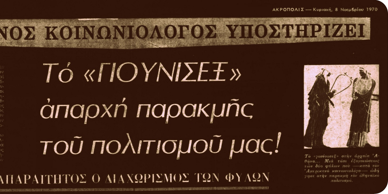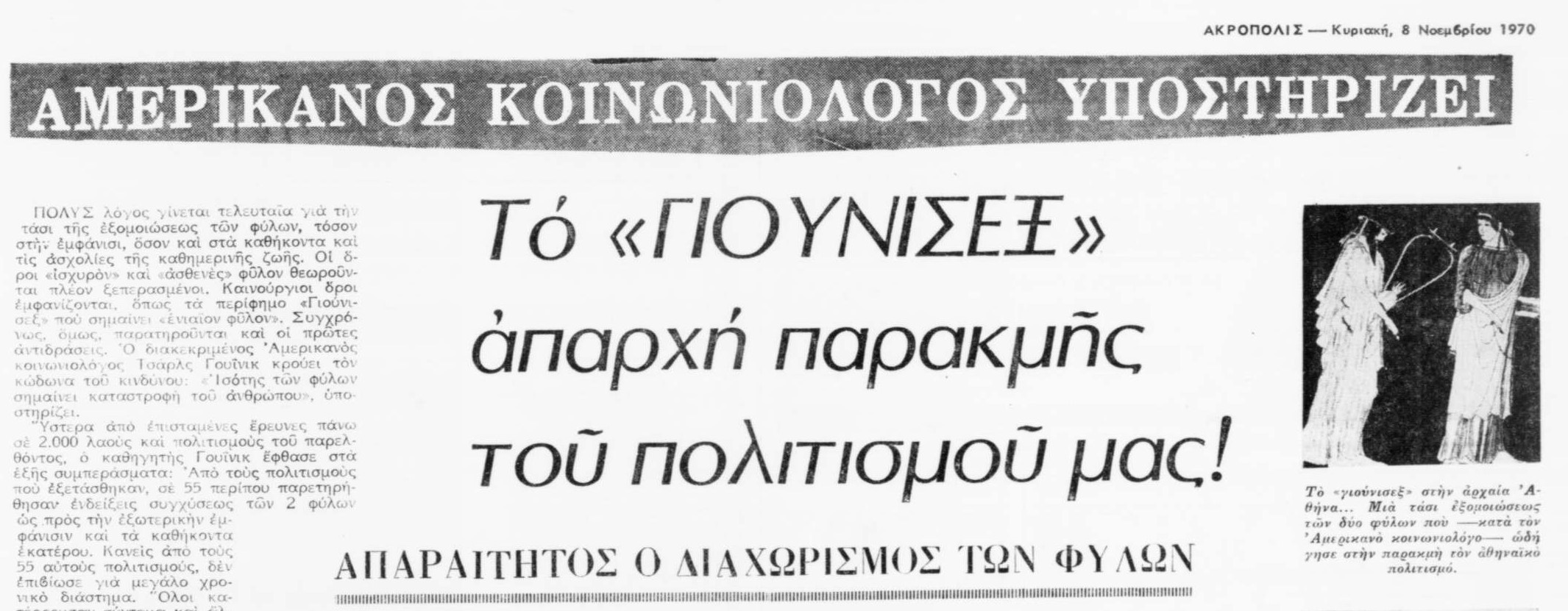Άκρως επίκαιρο είναι ένα άρθρο με τίτλο «Το ΓΙΟΥΝΙΣΕΞ απαρχή παρακμής του πολιτισμού μας», που είχε δημοσιευθεί στις 8 Νοεμβρίου 1970 (σελ. 4) στην εφημερίδα «Ακρόπολις»12.