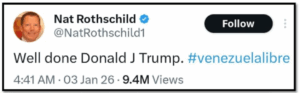«Μπράβο Ντόναλντ Τζ. Τραμπ» έγραψε στο Twitter ο Νατ Ρότσιλντ αμέσως μετά την…ΠΑΡΑΝΟΜΗ επιδρομή του Τραμπ στη Βενεζουέλα!!! Δείτε το εξής τουίτ (ανάρτηση) του στο «X»…