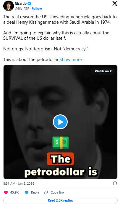 Και τώρα ο Μαδούρο. Με πέντε φορές περισσότερο πετρέλαιο από ό,τι ο Σαντάμ και ο Καντάφι μαζί. Ενεργή πώληση σε γιουάν. Δημιουργία συστημάτων πληρωμών εκτός του ελέγχου του δολαρίου. Αίτηση για ένταξη στους BRICS. Συνεργάζεται με την Κίνα, τη Ρωσία και το Ιράν. Οι τρεις χώρες που ηγούνται της παγκόσμιας αποδολαριοποίησης.