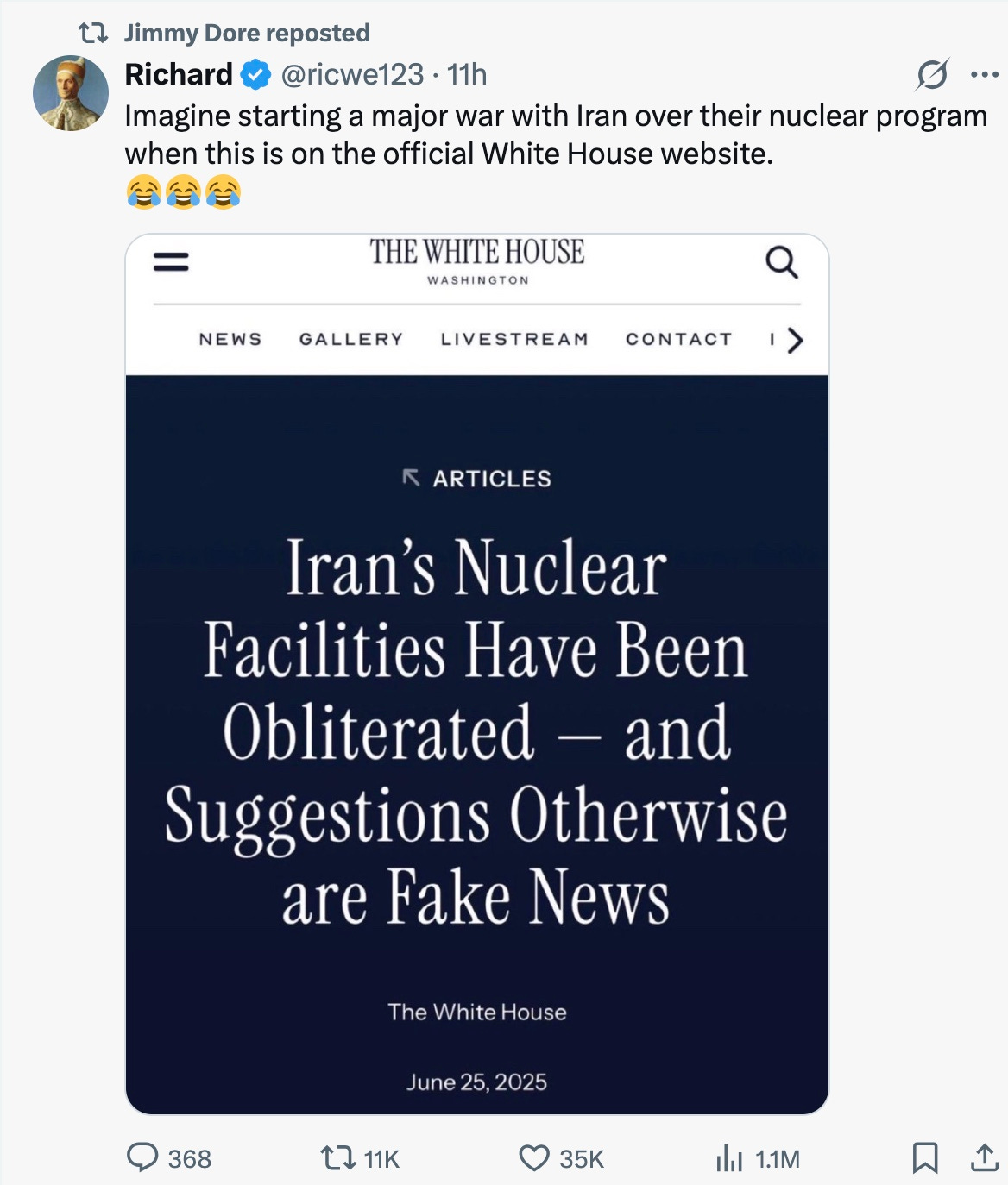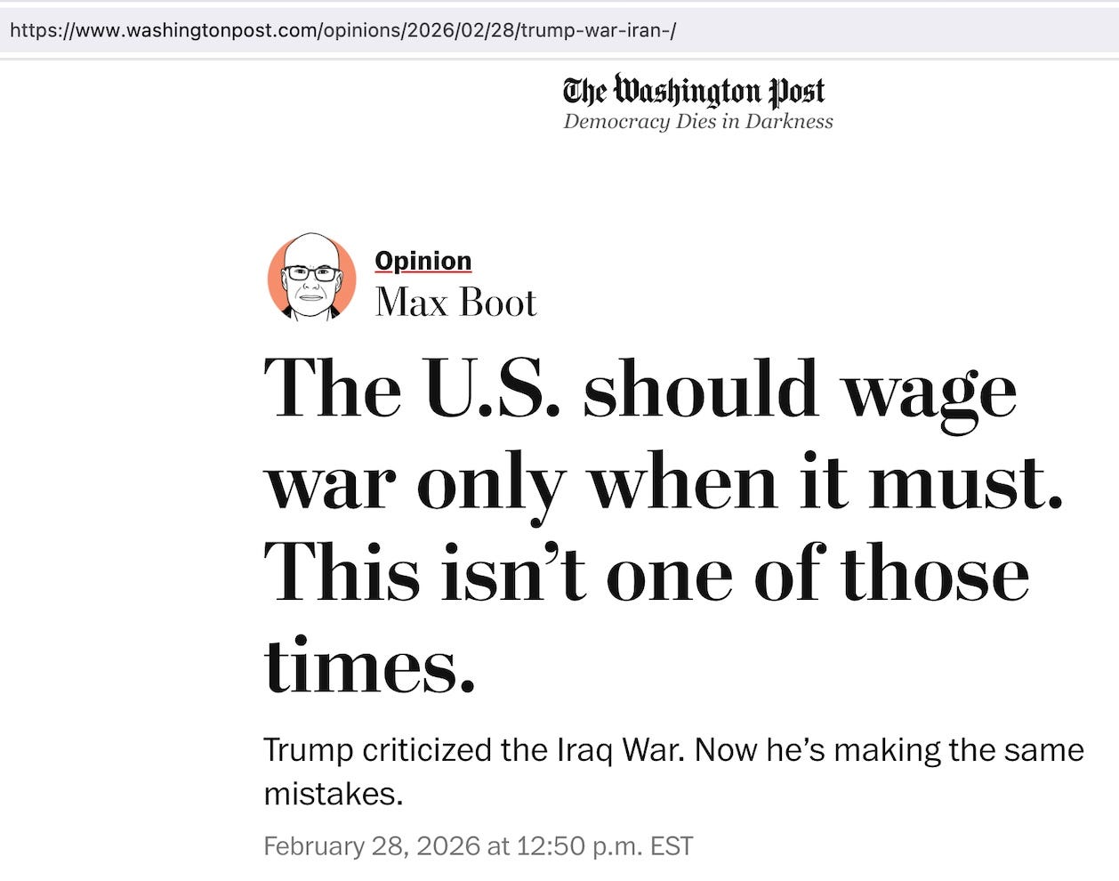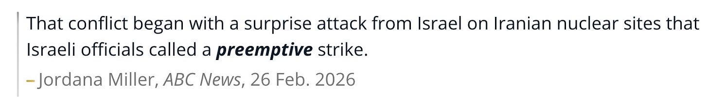 Παρακαλώ σταματήστε να με παραπέμπετε στην ανάρτηση του Jeff Childers για τον πόλεμο του Ιράν σήμερα. Η λογική του «Τους προειδοποιήσαμε, άρα δεν ήταν τελικά προληπτικό χτύπημα» μπορεί να λειτουργήσει σε έναν εγκεφαλικά νεκρό δικαστή, αλλά όχι σε μένα.