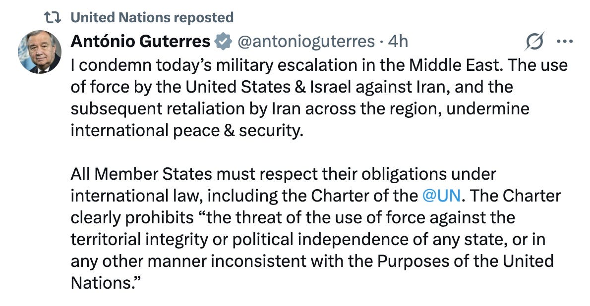 Δεν αντέχω τον Άντονι Γκουτέρες, τον Γενικό Γραμματέα του ΟΗΕ – αλλά εδώ παραθέτει με ακρίβεια τον Χάρτη των Ηνωμένων Εθνών, ο οποίος είναι το πρότυπο του διεθνούς δικαίου που δείχνει ότι οι ΗΠΑ είναι η παράνομη χώρα εδώ, μαζί με το συνηθισμένο παράνομο, το Ισραήλ.