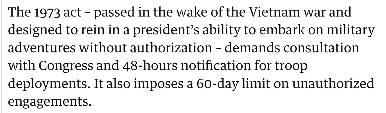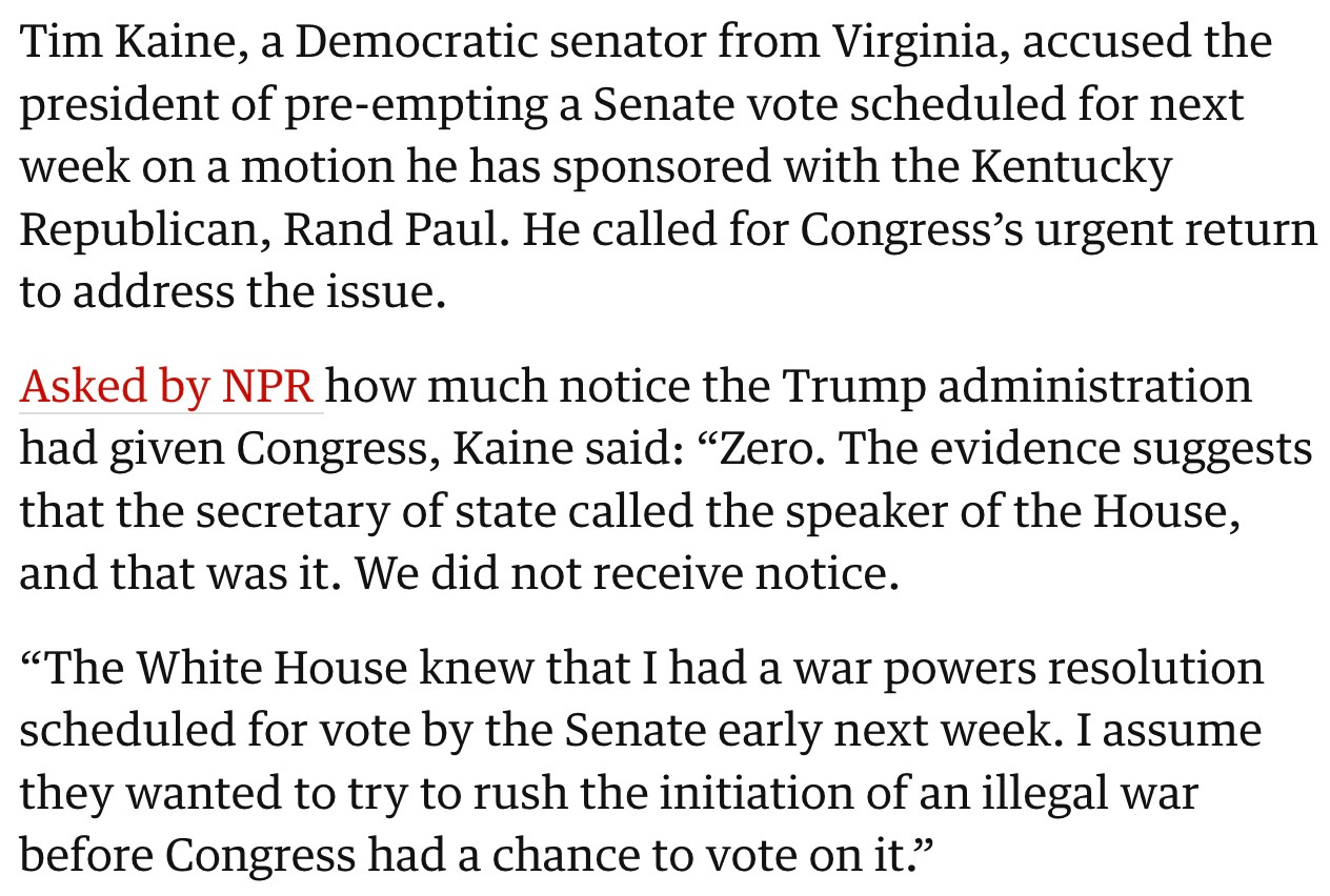Ακόμη και σύμφωνα με τα πρότυπα των ΗΠΑ για την έναρξη ενός πολέμου, η ομάδα του Τραμπ παραβίασε τους κανόνες, αποτυγχάνοντας να ειδοποιήσει ή να συζητήσει την επίθεση με 8 βασικά μέλη του Κογκρέσου: